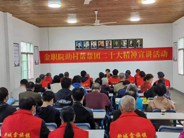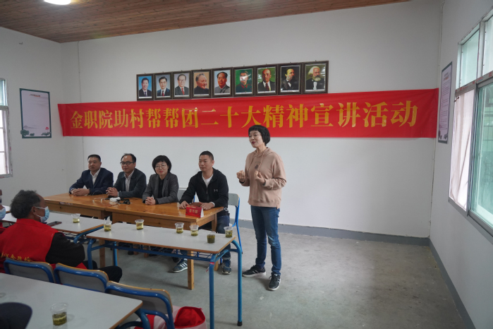 10月28日,金华职业技术学院党委委员、纪委书记徐领,党委委员、组织部部长、离退休工作处处长李文婷带领 “助村帮帮团”成员和部分退休教师,赴武义柳城畲族镇青坑村开展银领先锋助力共建共富暨二十大精神宣讲活动。