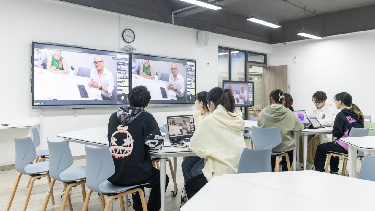 而在第二现场,陈海荣、怀卡托国际学院领导班子成员、艺术设计专业师生进行观摩聆听。陈海荣表示,“艺术”在插上“科技”的翅膀之后,通过“空中工作坊”让中新师生可以实现共备、共上、共评一堂课,真正实现了跨越国界、时差、语言共享教学资源,为高职中外合作办学提供可借鉴的范例。此外,中新双方学生也表示参加“空中工作坊”,真正激发了他们自身的学习动力,在不同国籍、不同文化背景的同学间交流萌生了更多的创意。