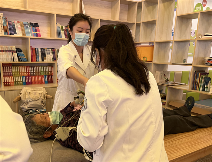 “奶奶,请问您哪里有不舒服?可以告诉我们老师。”临床专业的贾瑛琦同学一边帮助做心电图的老人躺上体检台,一边耐心询问老人的身体状况。