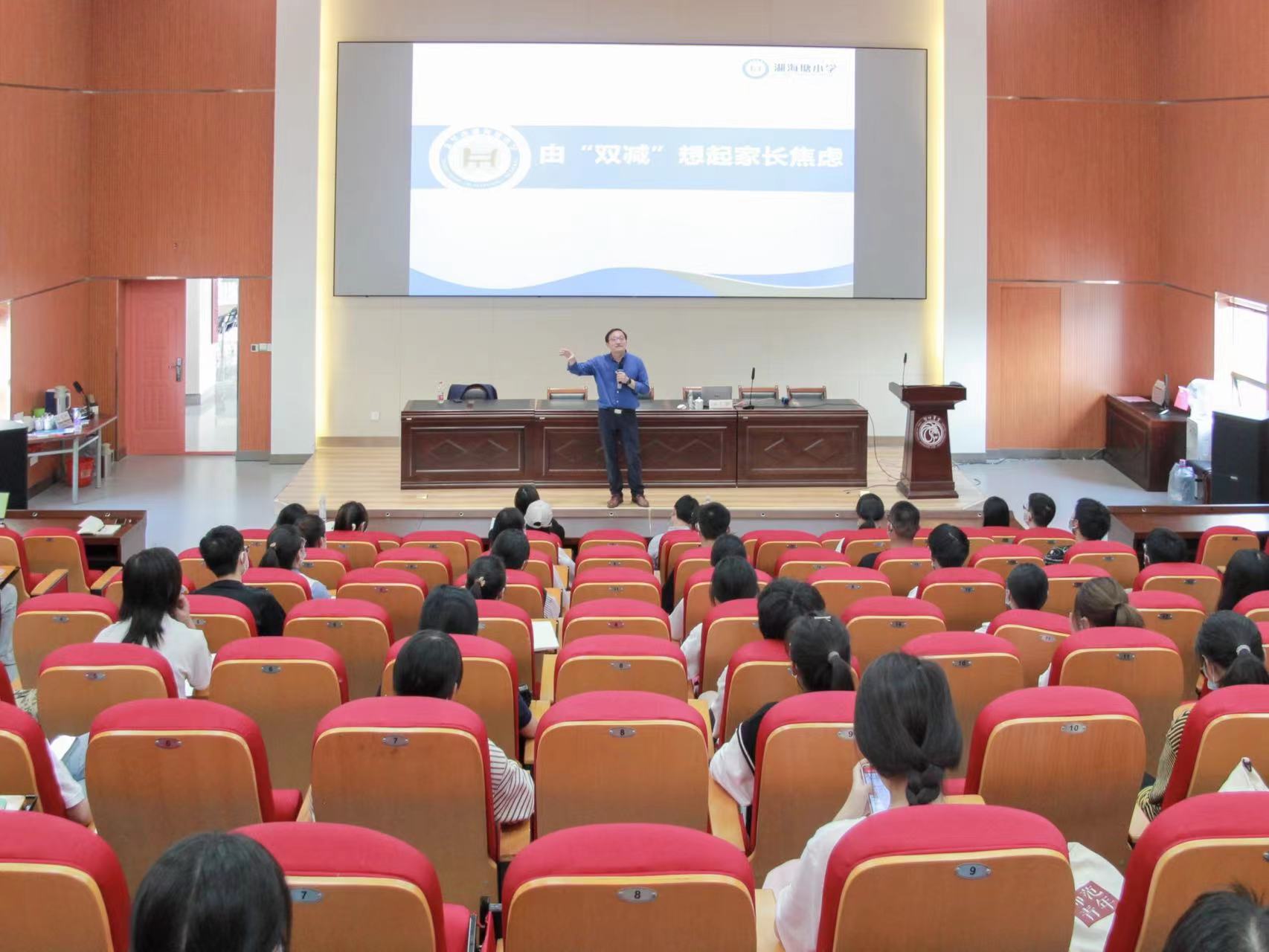 讲座伊始,吴志坚通过几个充满趣味的生活例子调动现场氛围,瞬间拉进了与学生的距离。“双减”是当前基础教育的热点议题,他从“双减”政策提出背景出发,指出“双减”目标与教育均衡发展是相一致的,而后从“社会资本”和“社会阶层”的视角分析家长为何如此焦虑,并强调了文化的核心价值。接着,他带领大家思考学校、家庭、社会该如何均衡各种取向以改变现有的困惑和困局,不仅强调了教育要为培养人服务,还激励同学们要积极进取、向上攀登,因为“小学同样需要大师”!