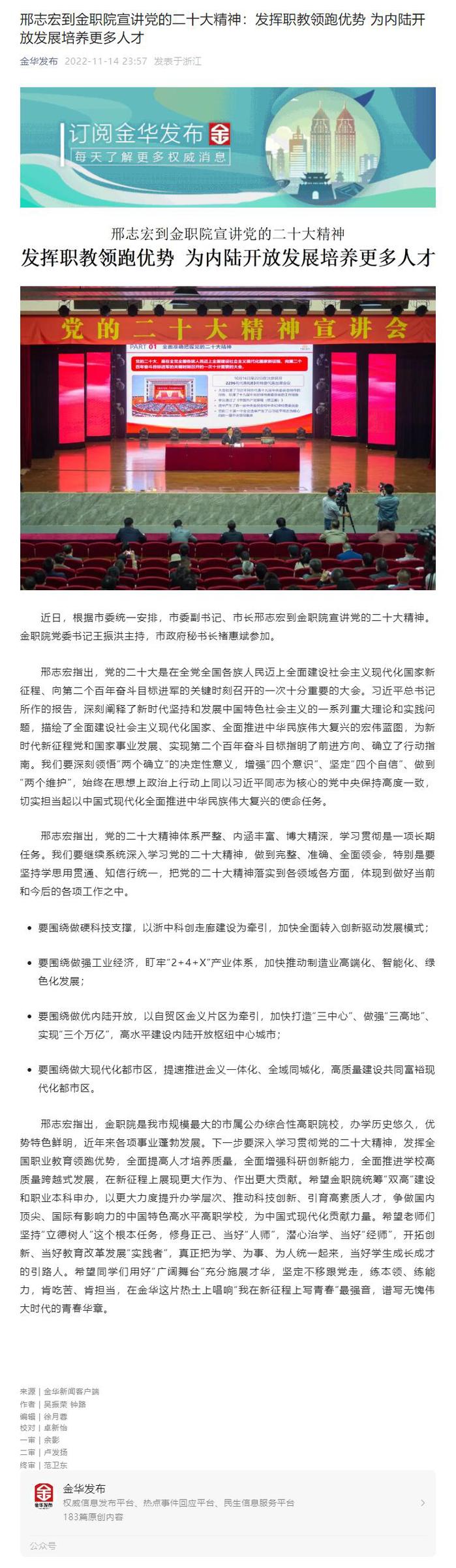 金华发布:邢志宏到金职院宣讲党的二十大精神:发挥职教领跑优势 为内陆开放发展培养更多人才