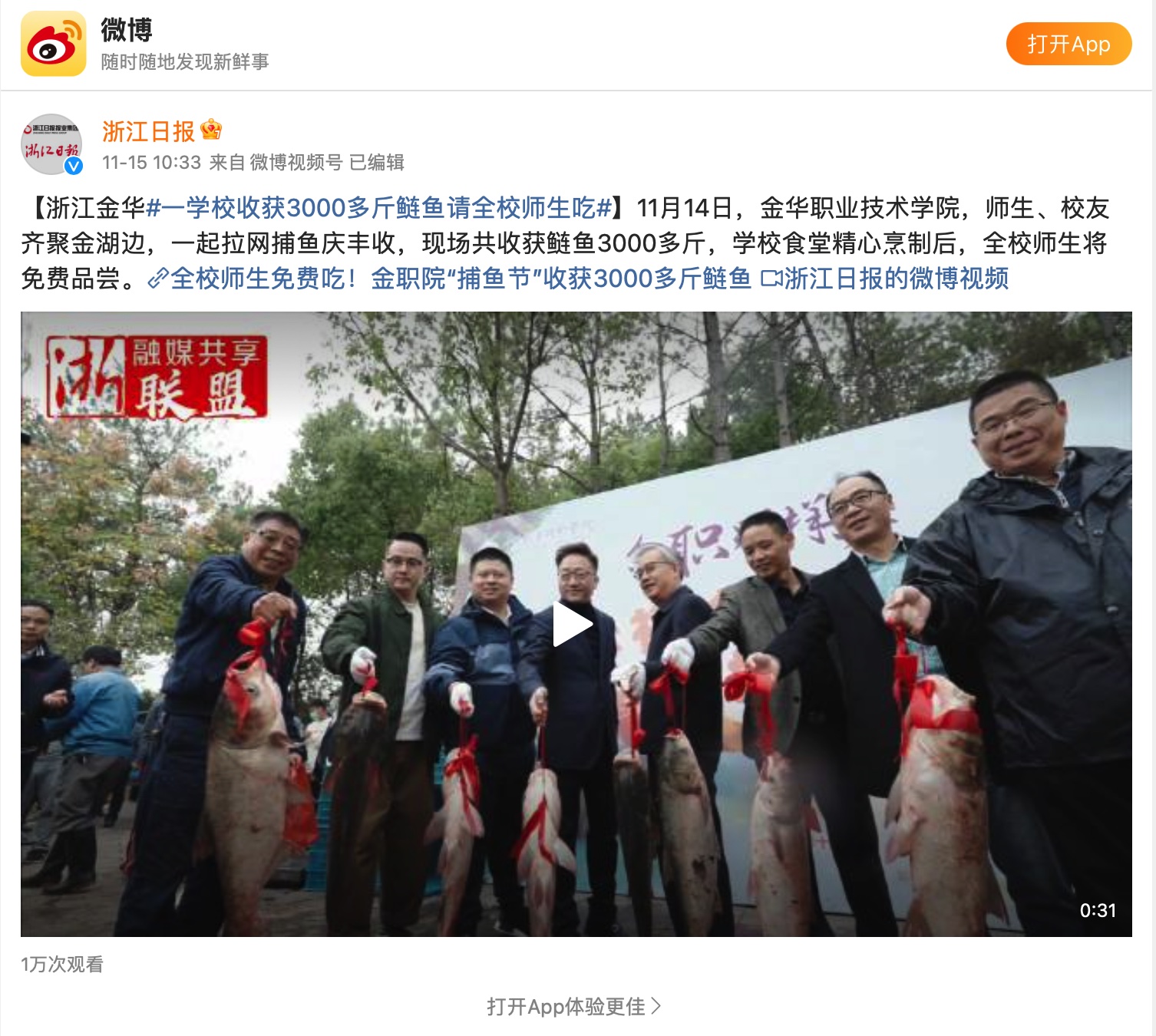 微博:浙江日报:【浙江金华#一学校收获3000多斤鲢鱼请全校师生吃#】