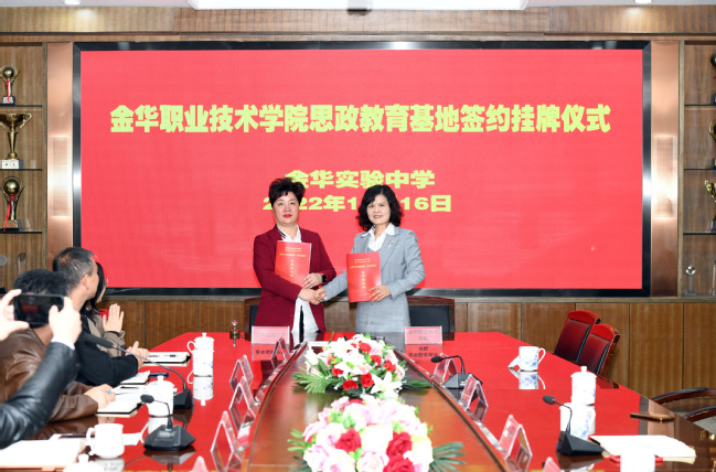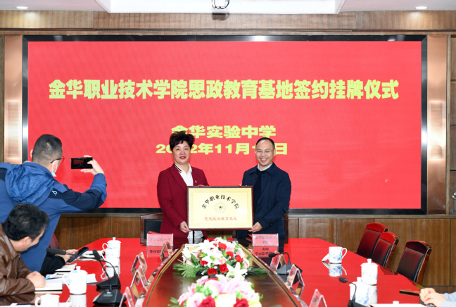 11月16日,金职院公共基础学院(马克思主义学院)相关负责人和金华实验中学校长俞秀玲共同为“金华职业技术学院思想政治教育基地”签约、揭牌。