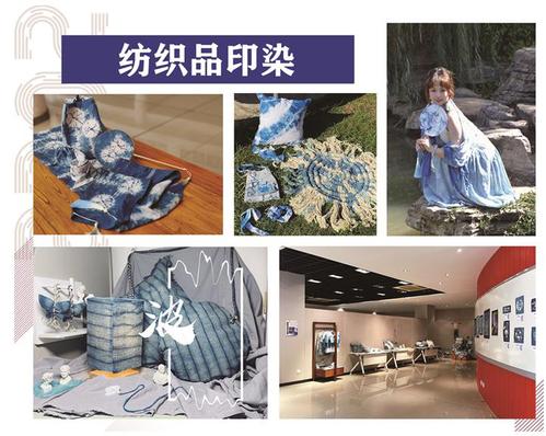 由于使用的是天然植物染料靛蓝,《纺织品印染》课程优秀作品区域呈现了一片蓝海,体现了自然古朴、绿色环保的设计理念。本次作品展共展出了运用传统“非遗”印染技艺——扎染、夹染、蓝印花布印染进行的图案设计作品25件,服装、家纺、配饰等14个系列作品80余件,综合运用传统印染技艺、结合现代审美趋势进行产品创新设计,让传统印染工艺“活”起来。
