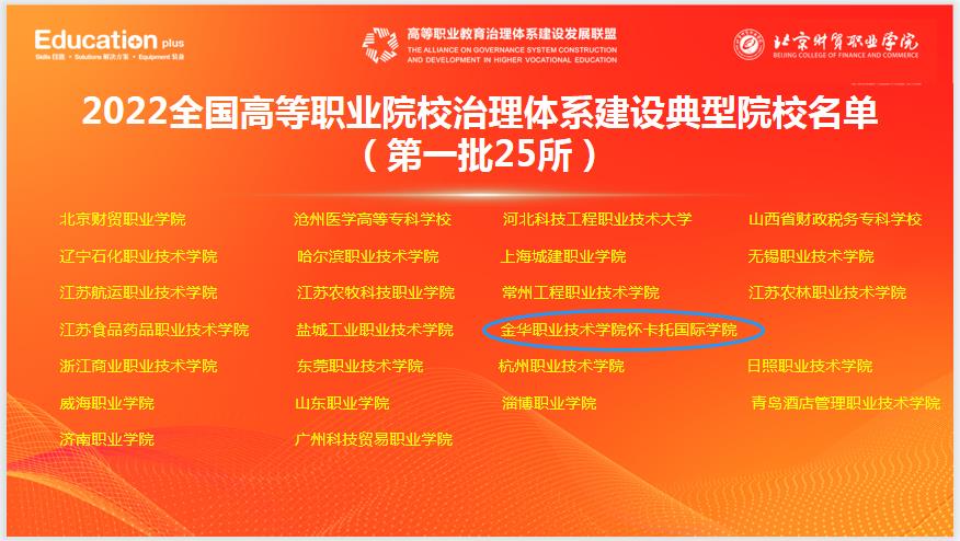 12月9日,在由EducationPlus国际职业教育大会组委会、高等职业教育治理体系建设发展联盟联合主办的2022 EducationPlus(第六届)国际职业教育大会上,公布了2022全国高等职业院校治理体系建设典型院校(50所),金华职业技术学院怀卡托国际学院作为全国唯一一所非独立法人中外合作办学机构入选第一批典型院校,选送的《聚焦内涵 引进借鉴 特色发展 打造示范性非独立法人中外合作办学机构》收录于《高职院校治理现代化助力中国式现代化—中国高职院校治理现代化报告2022》。