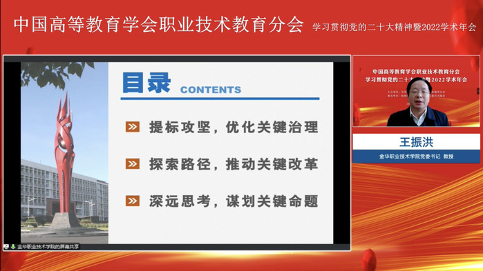 12月17日,中国高等教育学会职业技术教育分会学习贯彻党的二十大精神暨2022学术年会,以线上线下相结合方式成功举办,会议由中国高等教育学会职业技术教育分会主办,杭州职业技术学院、高等教育出版社承办。分会副理事长、金华职业技术学院党委书记王振洪在线参加会议,并应邀作题为“中国式职业教育现代化的金职实践与思考”的专题报告。