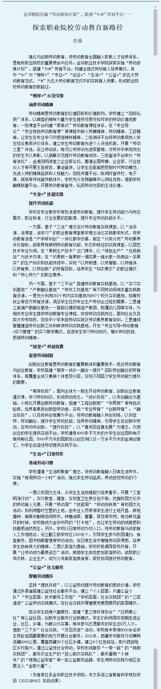 中国教育报:金华职院实施“劳动修身计划”,搭建“5+N”劳育平台——探索职业院校劳动教育新路径