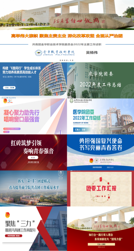 为全面总结学校共青团一年来工作成果和特色亮点,推动团学工作更加聚焦更加融合,思想引领更加深刻更加有效,实践育人更有成效更有特色,让学校共青团工作更具感染力、渗透力和生命力,12月21日下午,金职院举行2022年二级学院团委负责人述职会。副校长陈海荣,学工部、团委负责人,团委兼职副书记,二级学院分管学生工作领导,学工办、团委负责人参加会议。会议采用线上汇报交流的形式进行。