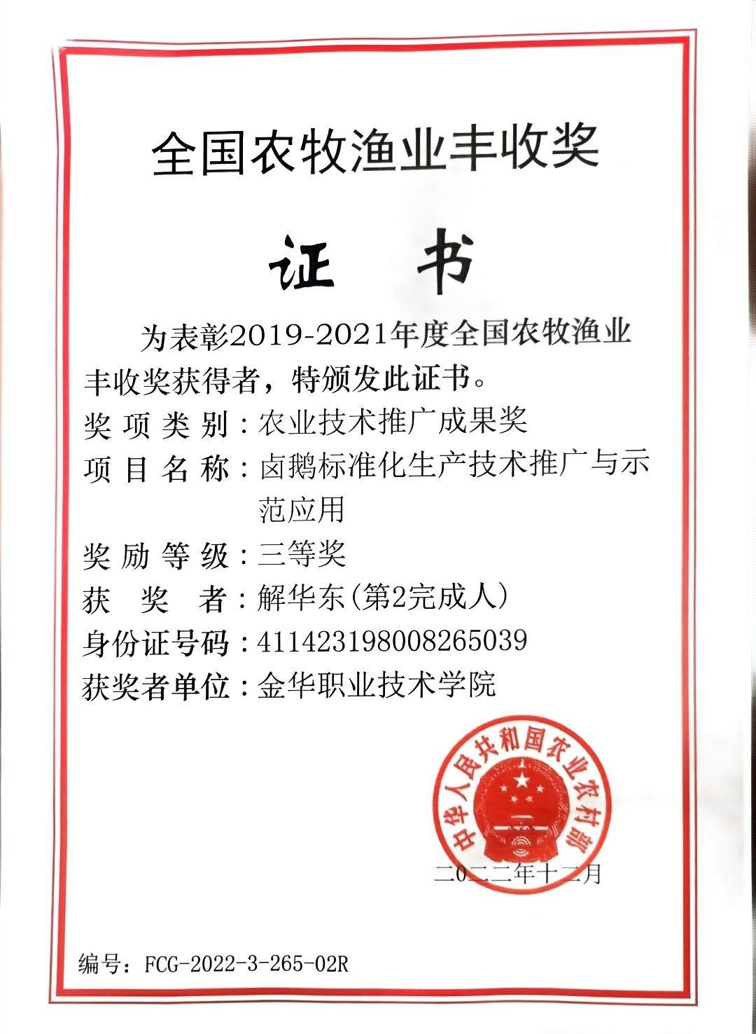 近日,农业农村部公布了2019-2021年度全国农牧渔业丰收奖获奖名单,金华职业技术学院农学院教师解华东博士与重庆市畜牧科学院食品加工研究所合作的卤鹅深加项目“卤鹅标准化生产技术推广与示范应用”荣获全国农牧渔业丰收奖农业技术推广成果奖三等奖。