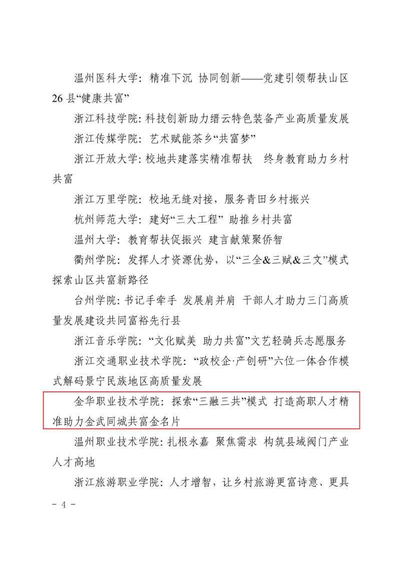 近日,浙江省教育工委公布了《高校干部人才助力山区26县高质量发展创新案例的通知》(浙教工委办函〔2022〕21 号),金职院的《探索“三融三共”模式  打造高职人才精准助力金武同城共富金名片》案例入选全省高校干部人才助力山区26县高质量发展创新案例(全省30个,其中高职高专11个)。