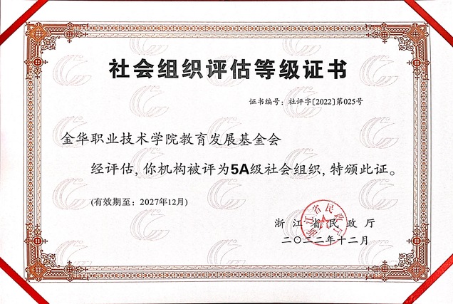 近日,根据《浙江省民政厅关于2022年度全省性社会组织评估结果的公告》获悉,金华职业技术学院教育发展基金会获评5A级社会组织,目前已收到证书和奖牌。