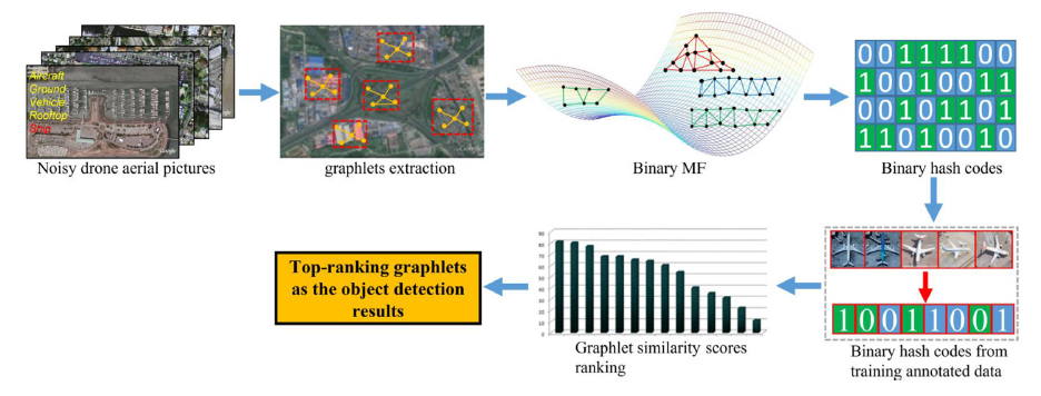 在过去十年中,无人机(UAV)已广泛应用于地质灾害监测、智慧农业和城市规划等领域。在本项研究中,作者将多种属性融合到一个耐噪声的哈希框架中,该框架能够极快地从无人机图片中检测对象。该方法能够本质上灵活地编码每个目标对象的各种拓扑结构,基于此可以在不同视角和高度下发现多尺度对象。此外,通过协同利用 L_f 和 L_1 范数,计算出的哈希码对于低质量的无人机图片和嘈杂的语义标签具有鲁棒性。更具体地,对于每一张搭载无人机的图片,作者提取其中视觉上/语义上突出的对象部分。为了表征它们的拓扑结构,我们通过将空间相邻的对象片段链接成一个小图来构建一个图形组件(graphlet)。随后,设计了一个二进制矩阵分解(MF)来层次化地挖掘这些图形组件的语义,其中三个属性:i) 深度二进制哈希码学习,ii) 污染图片/标签去噪,及 iii) 自适应数据图更新被无缝整合。这种多属性二进制MF可以迭代求解,进而每个图形组件被转换为二进制哈希码。最后,每张无人机照片中的图形组件对应的哈希码被用于基于排名的对象发现。在 DAC-SDC、MOHR 及我们自编的数据集上的全面实验已证明了我们方法的速度和准确性。此外,还设计了一个精细的 FPGA 架构来计算我们的哈希码。平均而言,在4K无人机视频上(无时间建模)达到了每秒57帧的对象检测速度。