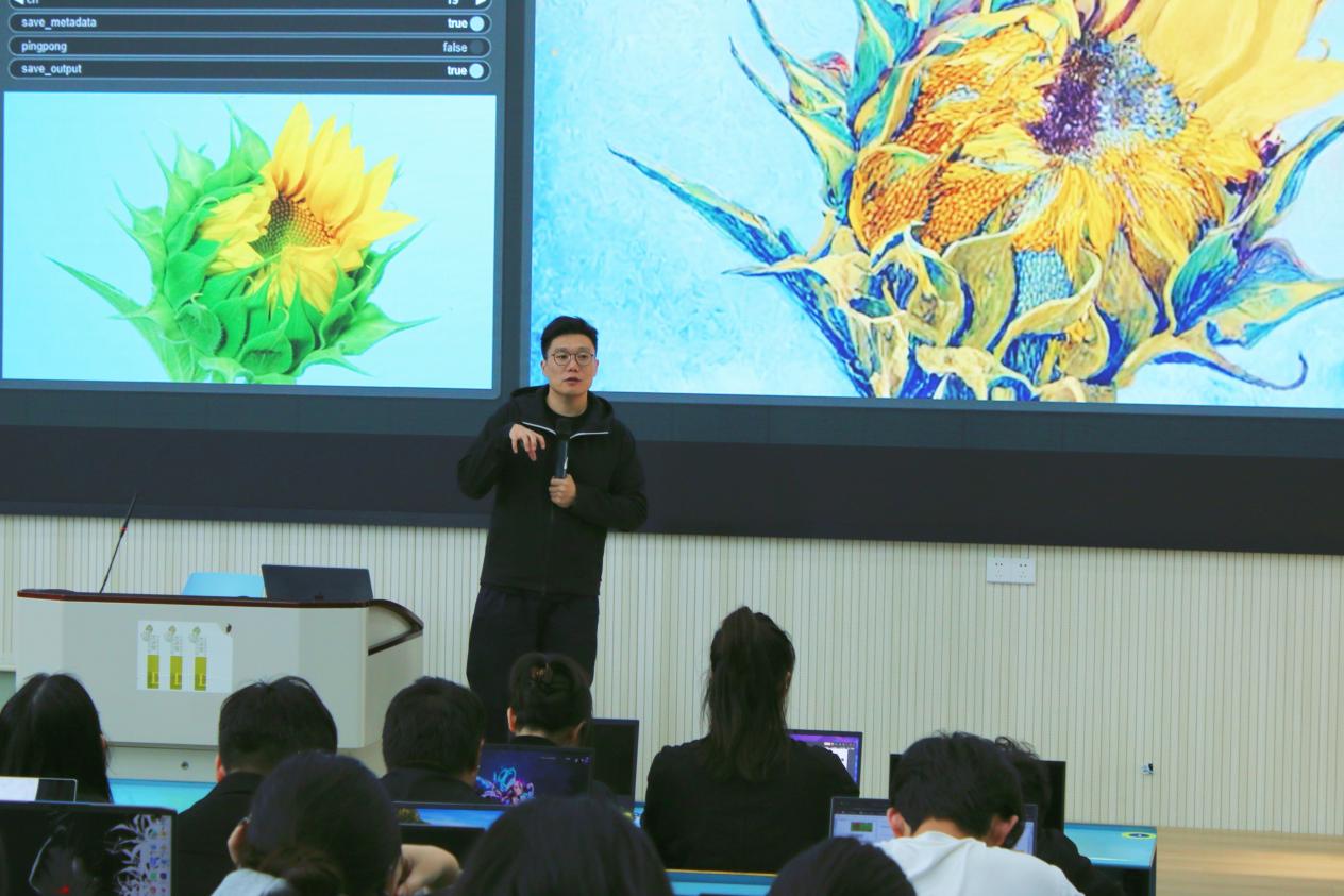 论坛上,阿里云体验设计专家胡峻老师和易北智建科技有限公司王圣安老师率先为同学们带来了AIGC入门与实操教学。现场专家充分利用PAIArtLab平台在图形图像生成、产品造型设计、插画绘制和风格迁移等方面的技术优势,通过详细的模型调入、参数调整、定制工作流等步骤演示,帮助同学们深刻理解如何在日常创作中巧妙运用AIGC技术提升设计效率,从而更加专注于设计概念的深化与实现。现场专家们不仅详尽展示了阿里云人工智能平台PAI-ArtLab操作方法,还通过亲身示范,教会了同学们如何利用该平台创作出具有个性化风格的图片。同学们热情高涨,纷纷动手实践,并与体验设计师们进行了面对面交流与互动。针对学生们提出的疑问,设计师们耐心细致地给予指导和解答。