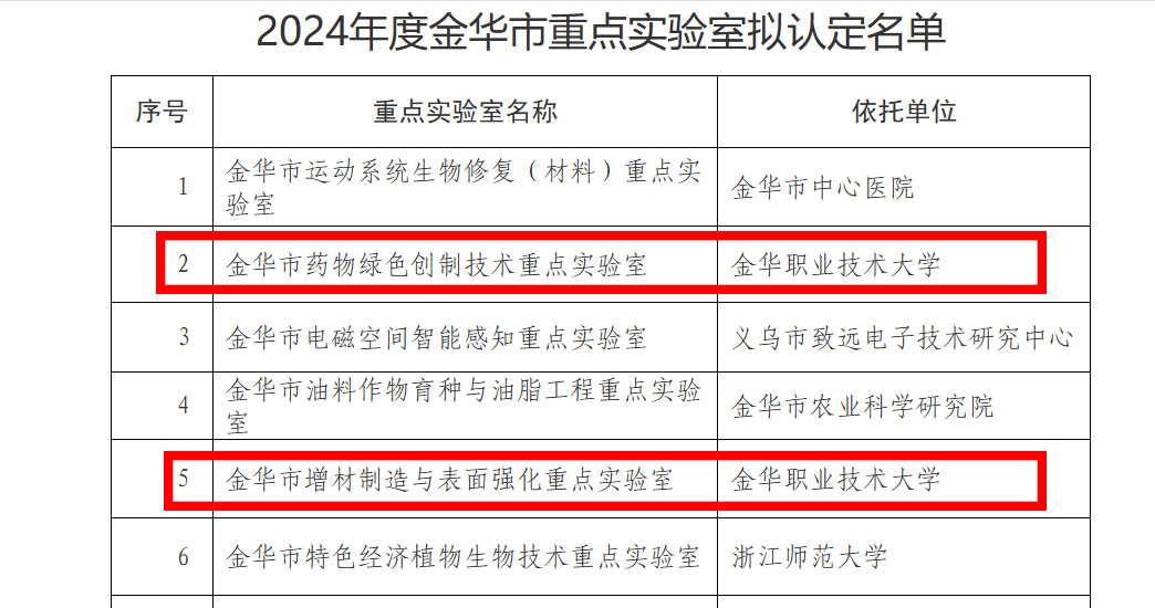 近日,金华市科技局公布了2024年度金华市重点实验室拟认定名单,学校金华市药物绿色创制技术重点实验室及金华市增材制造与表面强化重点实验室成功获批。两家实验室凭借扎实的科研基础和卓越的创新能力,经过多轮严格审核及实地考察后,最终顺利通过了认定。