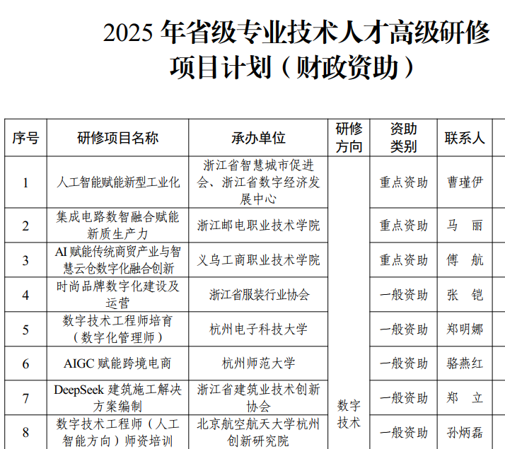 据悉,2025年度浙江省人社厅共收到全省300余期项目申报,经严格初审、行业推荐、专家评审等环节,最终确定58期省级资助项目(含重点类与一般类)。智能制造学院连续三年在激烈竞争中稳居资助榜单,充分体现学科建设与行业需求的精准契合。未来,学院将持续深化产教融合,优化研修课程体系,为打造新时代浙江“重要窗口”贡献职教力量。