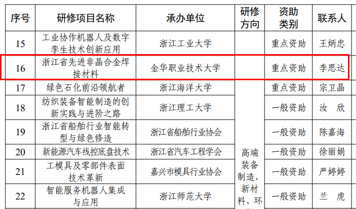 近日,浙江省人力资源和社会保障厅正式公布《2025年度国家级和省级专业技术人才高级研修项目计划》,智能制造学院申报的《浙江省先进非晶合金焊接材料》项目成功入选省级重点资助类高级研修项目。