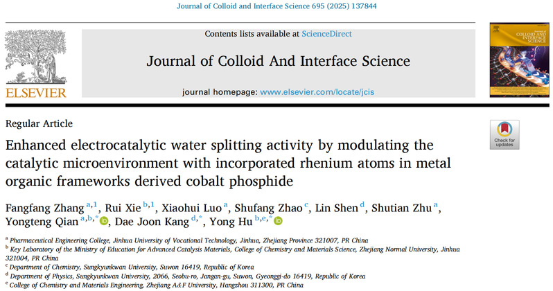 研究成果之二:Enhanced electrocatalytic water splitting activity by modulating the catalytic microenvironment with incorporated rhenium atoms in metal organic frameworks derived cobalt phosphide发表在Journal of Colloid and Interface Science(SCI 一区TOP,影响因子9.4)。该工作利用MOF衍生物优势,使用水热与原位磷化联用法,将Re原子引入Co-MOF衍生Co2P,通过独特的原子调控界面催化微环境方法,显著提升了催化剂催化活性。