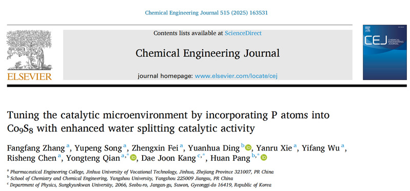 研究成果之一:Tuning the catalytic microenvironment by incorporating P atoms into Co9S8 with enhanced water splitting catalytic activity发表在Chemical Engineering Journal(SCI 一区TOP,影响因子13.4)。该研究基于界面微环境调控策略,将P原子引入Co9S8制备出P掺杂Co9S8电催化剂,成功优化了催化剂的电子结构和活性位点分布,上述催化剂展现出优异的电解水活性与催化稳定性。