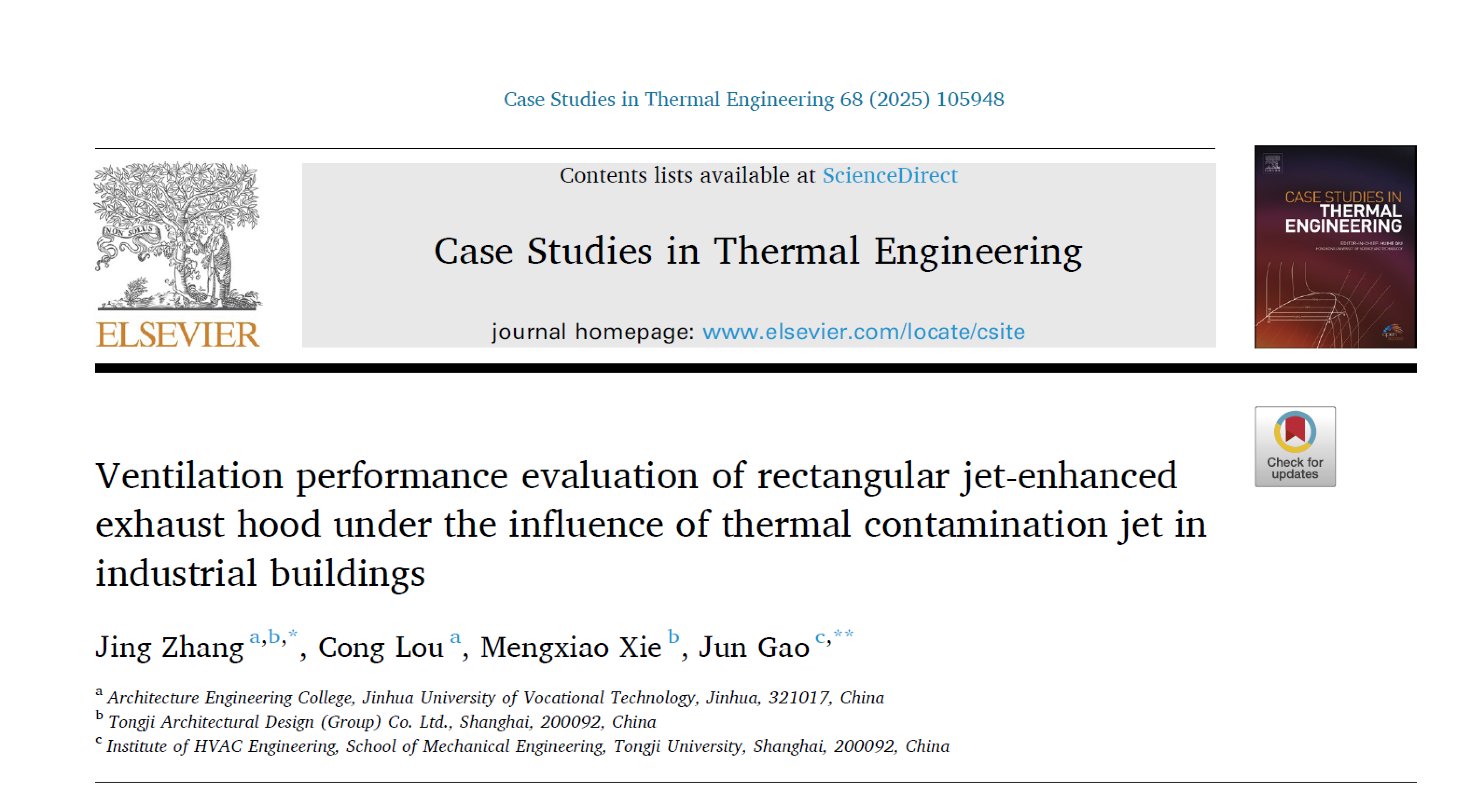 近期,建筑工程学院与同济大学(高军教授,共同通讯作者)进行密切的科研合作,并在工业污染物高性能捕集技术领域取得新进展,团队以建筑工程学院博士张婧作为第一作者和共同通讯作者、专任教师楼聪参与的研究成果《Ventilation performance evaluation of rectangular jet-enhanced exhaust hood under the influence of thermal contamination jet in industrial buildings》发表于SCI2区高水平期刊《Case Studies in Thermal Engineering》(影响因子6.4)。这项研究为开发高效、节能的工业排风末端设备提供新思路。该工作得到了浙江省自然科学基金、金华市科技计划项目的经费支持。在线地址为:https://doi.org/10.1016/j.csite.2025.105948。