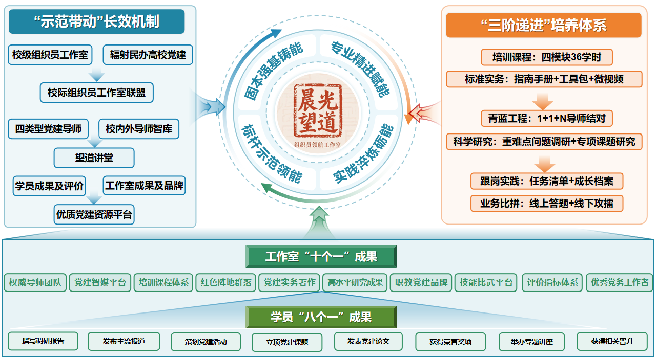 金职大“晨光望道”组织员领航工作室以金华职业技术大学高质量推进全国党建示范高校建设为载体,坚持“问题导向、精准育训、实践赋能、成果聚焦、长效发展”五大原则,确立了“个体—团队—全域”三级联动的一体化建设目标。工作室立足组织员职业发展全周期、全维度核心能力,提供全国党建“双创”项目院系跟岗、跟训、跟练、跟研培训,创新“理论筑基—能力进阶—实践增效—标杆领航”四位一体培养路径,系统实施“固本强基铸能、专业精进赋能、实践淬炼砺能、标杆示范领能”四大行动计划,打造专职组织员全链条培养体系,赋能组织员在党务与业务领域双提升。