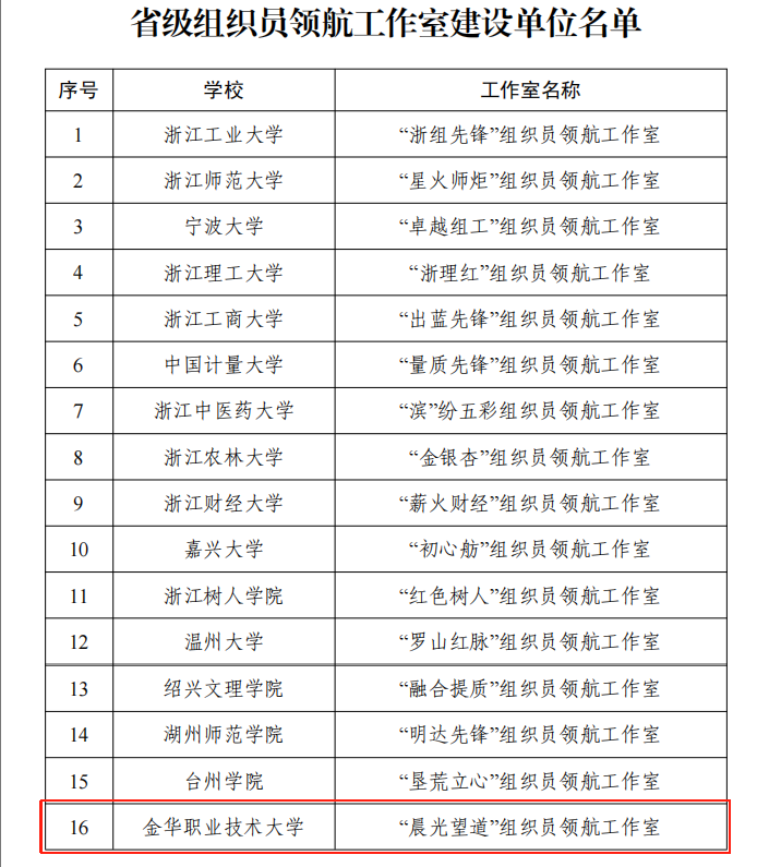 近日,浙江省委教育工委发文公布全省高校组织员领航工作室建设单位和“四强”组织员培养对象名单,确定20所高校为省级组织员领航工作室建设单位,金职大“晨光望道”组织员领航工作室成功入选,4名组织员入选“四强”组织员培养对象。