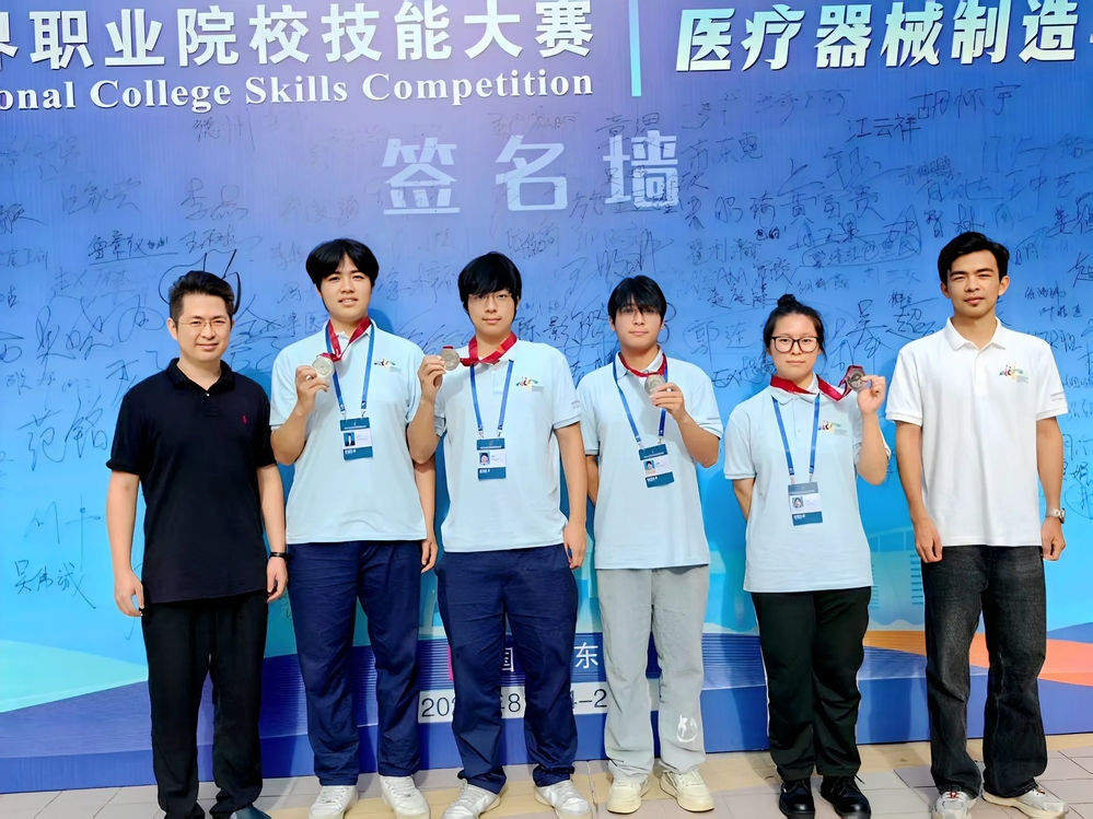 8月28日,2025年世界职业院校技能大赛总决赛“医疗器械制造与运维”赛道争夺赛在广东食品药品职业学院圆满落幕,来自全国各地高职院校的51支队伍同台竞技。由智能制造学院的李鑫东、医学院的史宇晨两位教师指导,江云祥、俞圣轩、高嘉诚、许久慧四位同学组成的参赛团队凭借扎实的专业技能、默契的团队协作以及稳定的临场发挥,最终荣获该赛道银奖。