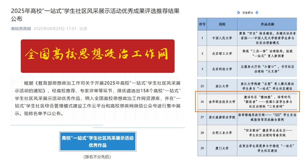 近日,由教育部思想政治工作司主办、全国高校思政网承办的2025年全国高校示范“一站式”学生社区风采展示活动评选结果正式公布。金职大《激活社区“微细胞”,培育时代“新医者”——医路仁家学生参与社区治理的“三色密码”》入选该展示活动的“学生参与”类优秀作品。