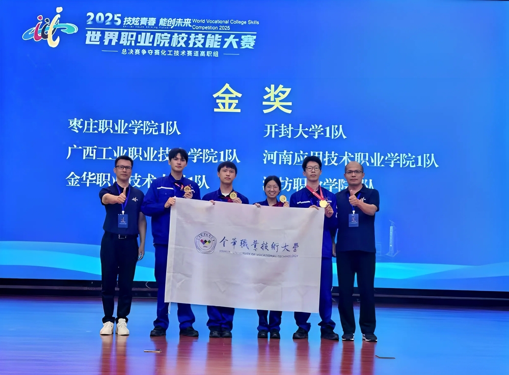 8月30日,2025年世界职业院校技能大赛总决赛争夺赛“化工技术”赛道在枣庄职业学院、东营职业学院圆满落幕,来自全国各地高职院校的105支队伍同台竞技。由制药工程学院蒋伟华、陈崇来两位教师指导,杨欣怡、童博帆、王海斌、宋文涛四位同学组成的队伍在激烈的角逐中发挥出色,最终斩获该赛道争夺赛金奖。