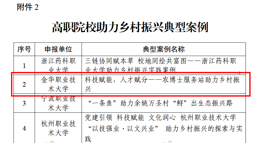近日,浙江省教育厅公布了第四届高校助力乡村振兴典型案例评选结果。学校报送的《科技赋能,人才赋分——农博士服务站助力乡村振兴》成功入选,成为全省15个高职院校助力乡村振兴典型案例之一,这也是学校连续第四年获此荣誉。
