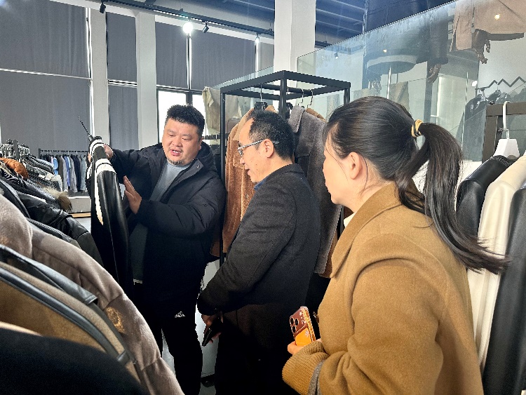 随后,调研组前往金华铭泰服饰有限公司考察交流。在企业负责人陈雪锋陪同下,成员实地参观了智能化生产车间、产品研发中心与样衣展示中心,深入了解企业在智能制造与新产品开发方面的实践成果。陈雪锋重点介绍了公司当前聚焦的“非遗+皮革”创新融合设计方向,展现了企业在传统文化传承与现代产品创新方面的积极探索。