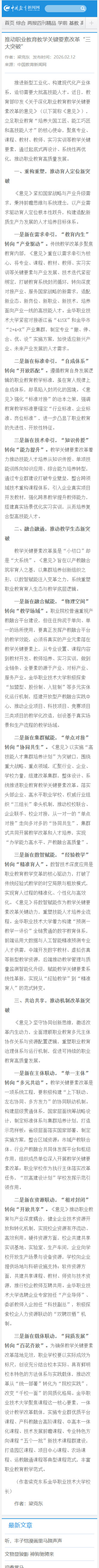 2月12日,中国教育新闻网发布我校校长梁克东的署名文章:《推动职业教育教学关键要素改革“三大突破”》,全文内容如下: