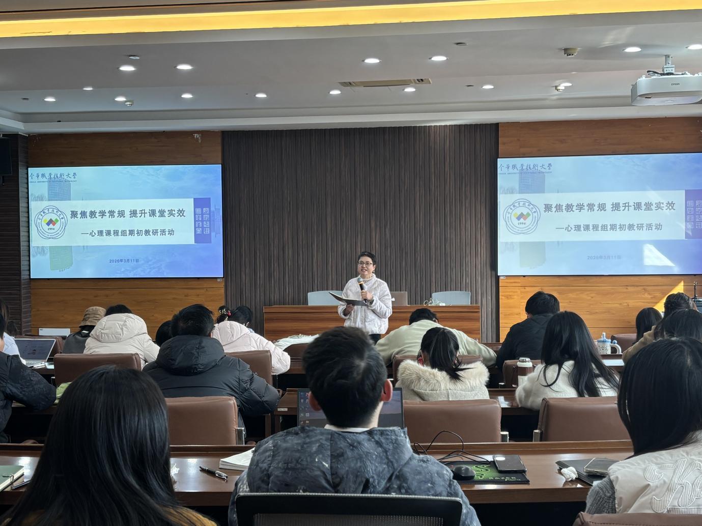 为进一步规范心理健康教育课堂管理,破解教学共性问题,提升教师课堂驾驭能力,保障课程教学效果,3 月 11 日下午,我校心理健康教育咨询中心举办以“聚焦课堂常规、提升教学实效”为主题的心理课程组期初教研活动。校级督导贾美倩、心理课程组专职督导章尚贞到场指导,课程组教师共60余人参会。