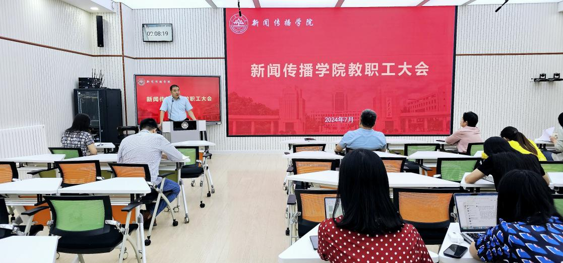 倪万结合近半年来学院工作情况作出整体部署并提出明确要求。具体从学院半年来加强规范化建设及决策流程,推进学院建章立制,总结学院各类报告,加快出版学院建设,学院学科建设,学院人事考核与人才引育,学院暑期及下学期部分重点工作等方面对全体教职工进行工作总结和通报。