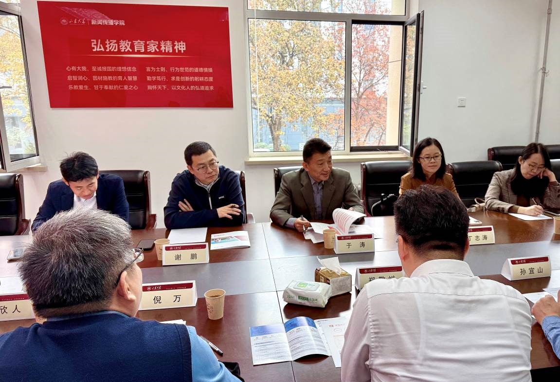 11月12日,中国外文局副局长、机关党委书记于涛一行来我院调研座谈,就进一步推进双方合作进行沟通交流。山东大学人文社科院院长郑敬斌、副院长王彦伟、新闻传播学院党委书记孙宜山、副院长倪万(主持行政工作)、副院长邱凌及教师代表参加座谈会,会议由倪万主持。