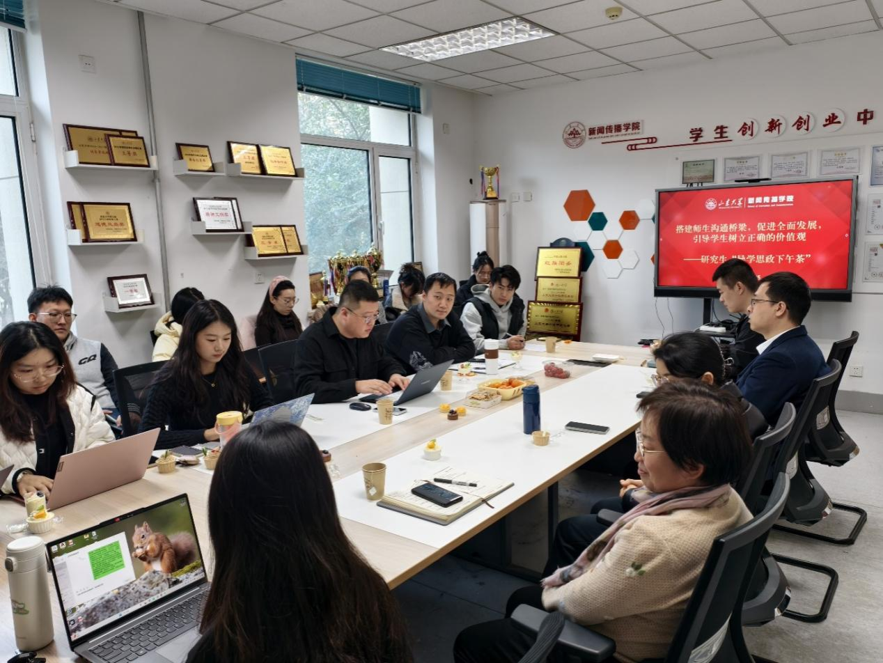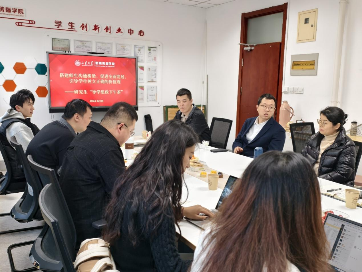 12月5日下午,新闻传播学院举办了以“搭建师生沟通桥梁,促进全面发展,引导学生树立正确的价值观”为主题的“导学思政”下午茶,本次活动聚焦“研究生心态调整和自我的意义”。学院党委副书记王丽君,院长助理于智源,导师代表张彩霞,学生心理健康教育与咨询中心老师孙长玉,研究生教务秘书韩恺,吕晓峰老师和硕士生代表进行了交流。活动由团委副书记(主持工作)张忠潮主持。