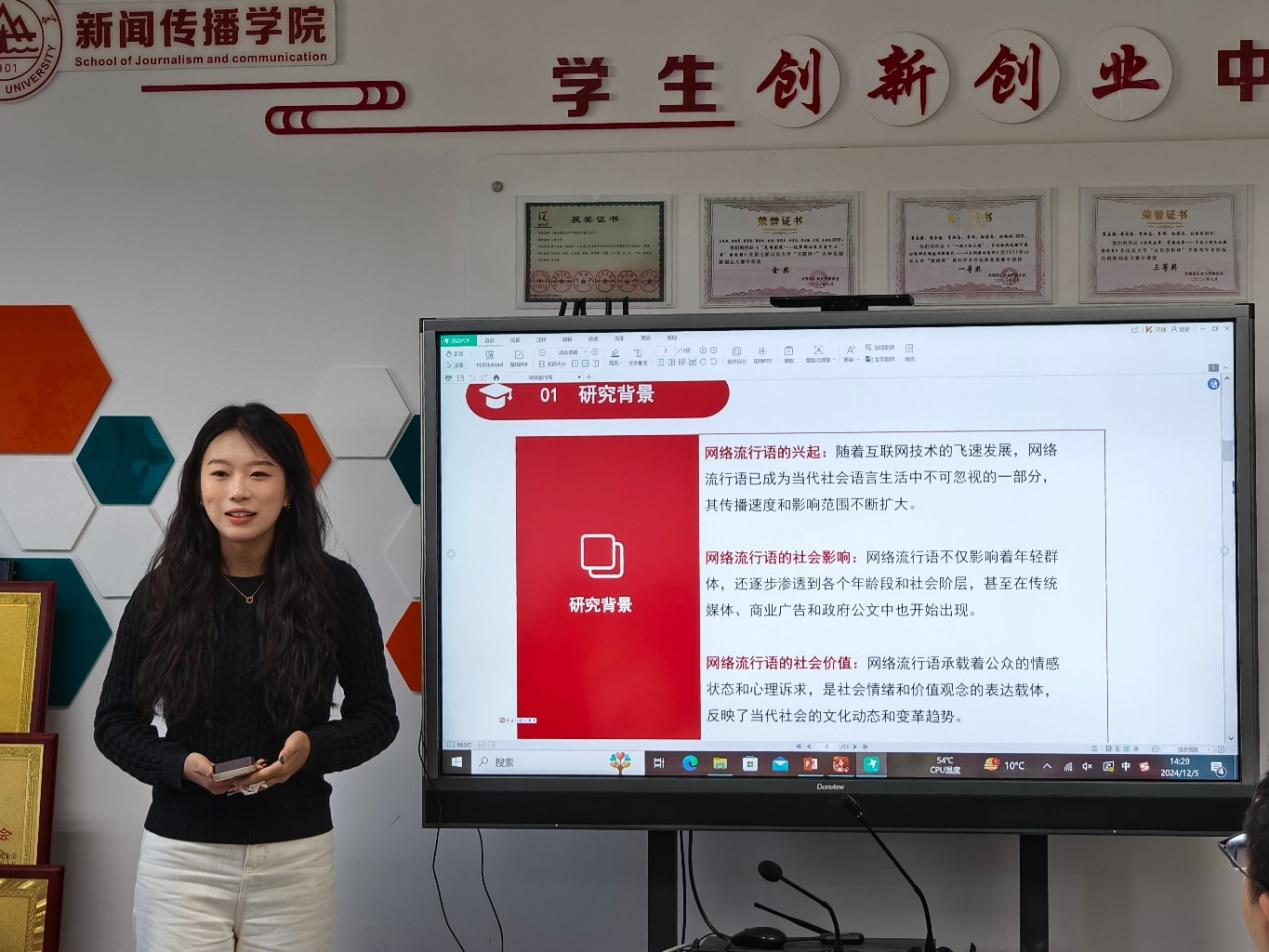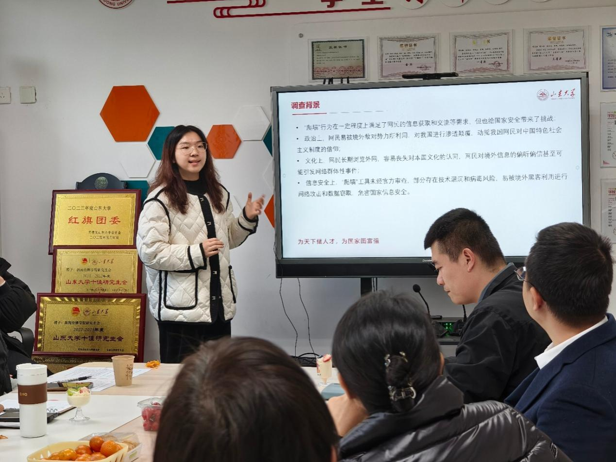 接下来,2023级硕士研究生代表常静娴以“新时期大学生的网络流行语使用与应对策略研究”为主题进行分享。随着互联网技术的飞速发展,网络流行语已成为当代社会语言生活中不可忽视的一部分。网络流行语通常伴随热点事件迅速兴起,承载着公众状态和心理诉求,是社会情绪和价值观念的表达载体。这些流行语如同一面镜子,反映了当代社会的文化状态和变革趋势,为理解和把握时代脉搏提供了独特的视角。2023级硕士研究生代表禹文笛以“网络爬墙现象简析及党支部与团支部工作的应对”为主题进行分享,阐述了团队研究内容,指出研究对大学生群体党团组织建设的指导意义,如党和团支部应加强校园网络管理,开展网络安全大赛等丰富多彩的活动增强学生对网络安全的了解,以及通过加强数据库建设提供更丰富的学习资源。