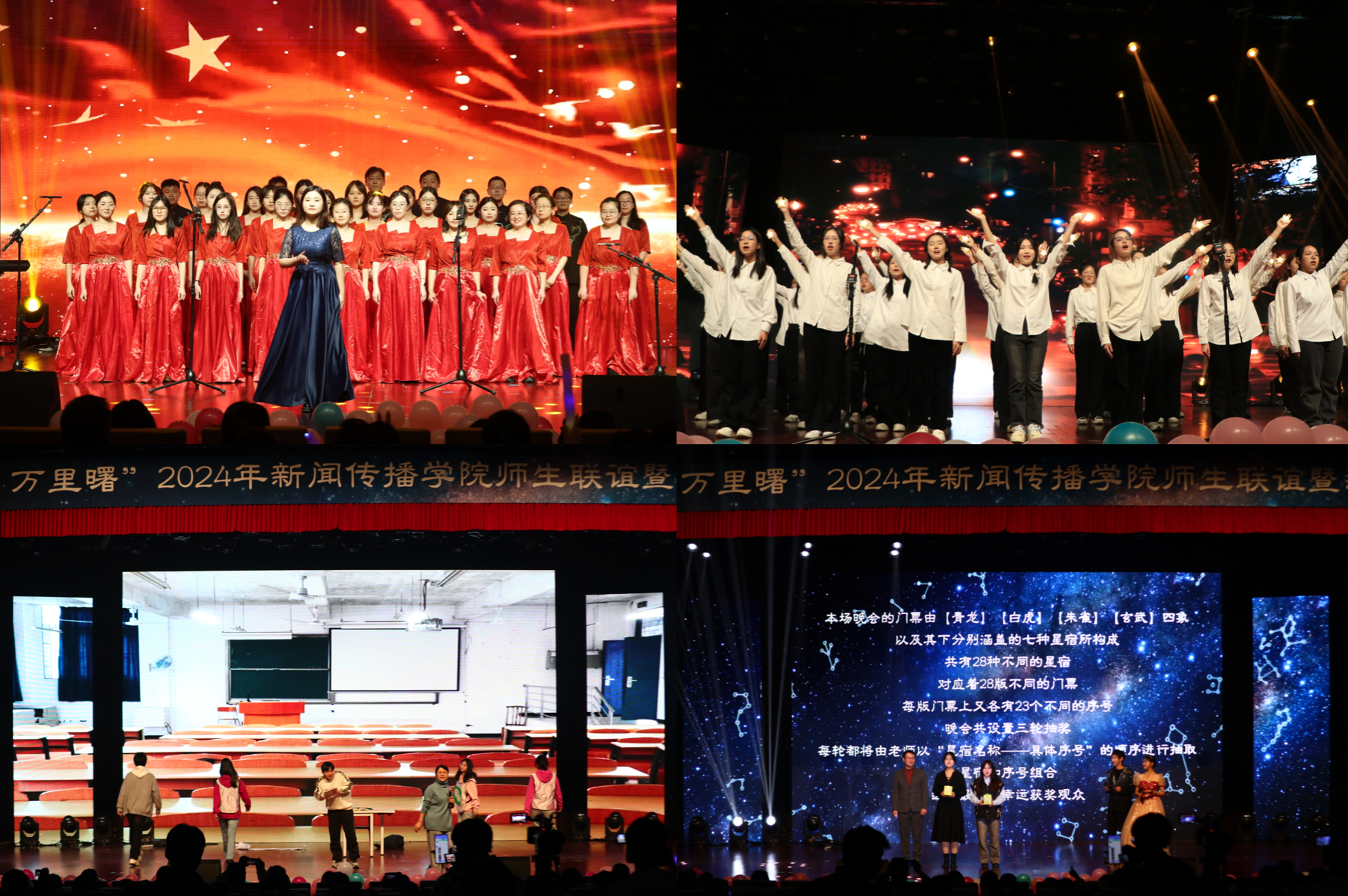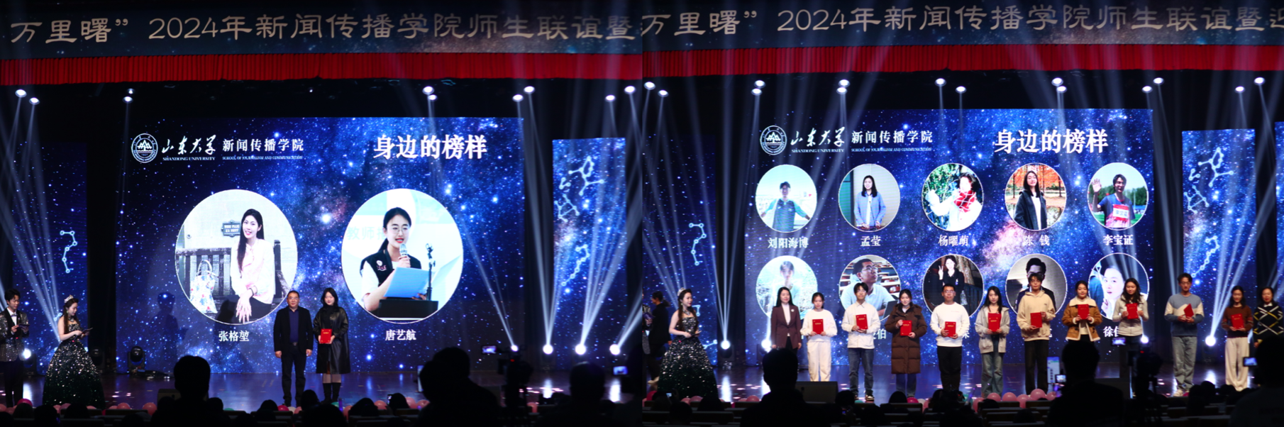 在新闻传播学院领导、老师的指导和“一委四会一中心”的共同努力下,师生联谊暨迎新晚会取得了圆满成功。这场晚会不仅是一场视听盛宴,更是学院坚持“五育并举” 教育理念的生动体现,展现了师生团结一心、共创美好未来的精神风貌。星光熠熠,其华灼灼。愿山东大学新闻传播学院未来可期,精彩无限;也愿山东大学欣欣向荣,蓬勃发展!