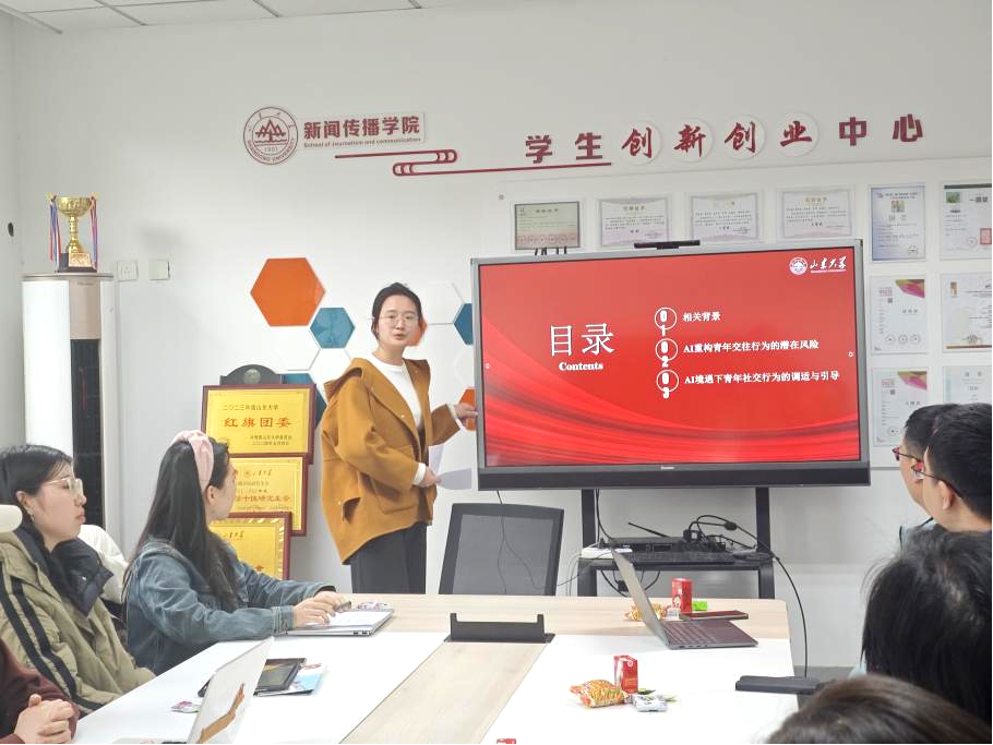 接下来,匡丽君同志以“AI重构青年交往行为的影响与调适”为主题进行分享。在数字化浪潮之下,生成式人工智能正改变我们的生活,在其构设青年社会交往新型基础设施和实践逻辑中可能存在类人陪伴与现实交往的阻抑,内容失真与交往道德遮蔽,资本布控与西方价值观输出等潜在风险。这一观点让同学们认识到在利用AI的同时要保持独立的思考判断,警惕虚拟交往对真实世界的代替,坚守正确的世界观、人生观、价值观。