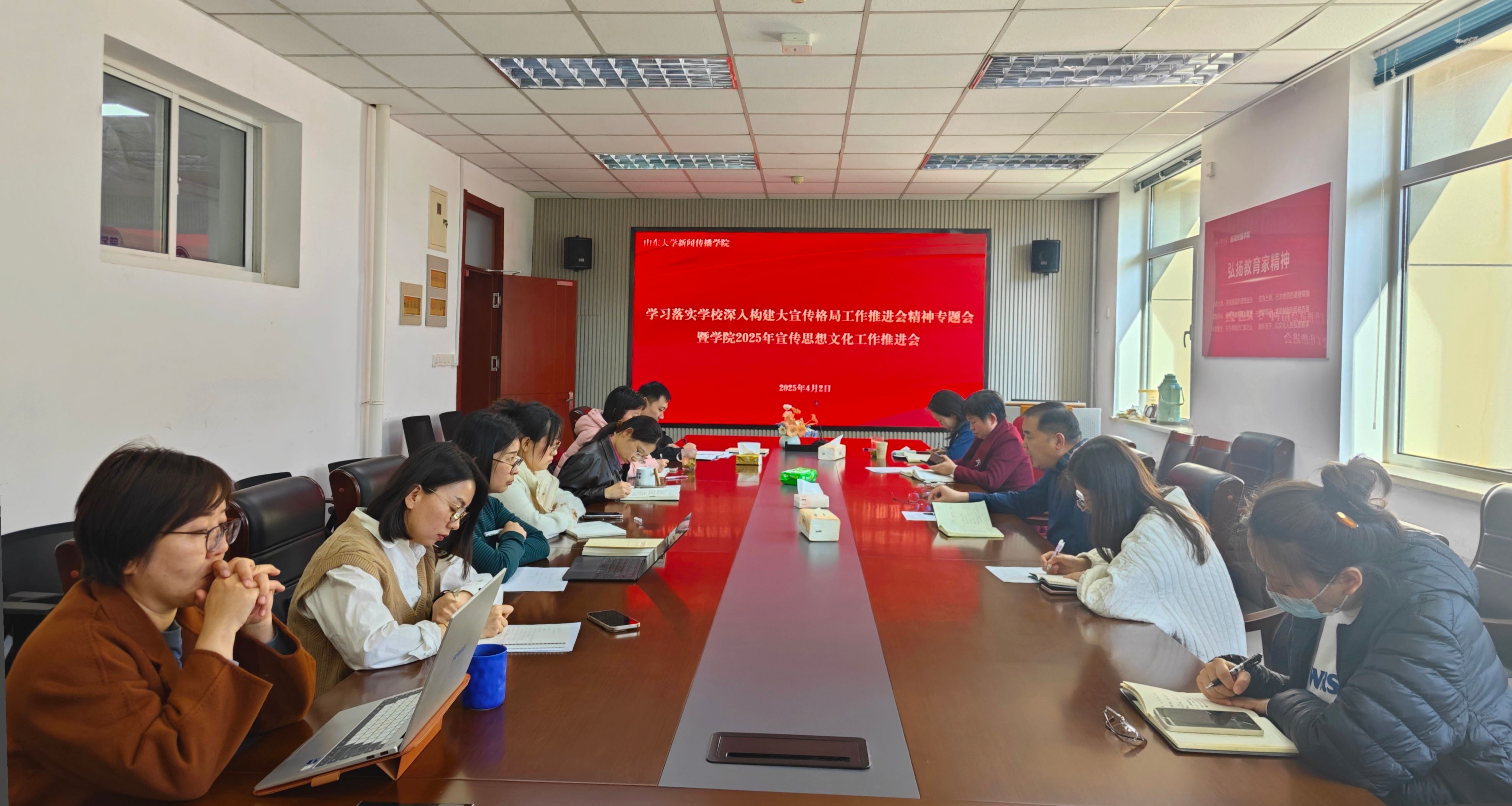 会上学习传达了学校深入构建大宣传格局工作推进会精神,专题学习了《山东大学2025年宣传思想文化工作要点》,分享了先进单位的经验做法和宣传模式。对于如何加强学院2025年宣传思想文化工作,会议提出,坚持树牢“宣无止境,守有底线”的理念,从以下方面聚力发力:一是自觉增强“人人都是宣传员”的意识,自觉成为大宣传格局的参与者、构建者、行动者;要围绕“学者、学生、学术”及学院发展方向和工作重点,积极主动开展新闻宣传;二是守牢意识形态主阵地,强化防范化解舆情风险能力,层层把好新闻宣传政治关,压紧压实各级责任;三是坚持问题导向,对标对表找差距、补短板、强弱项,及时总结各项工作成效,凝练亮点做法,讲好学院故事,展现学院形象。