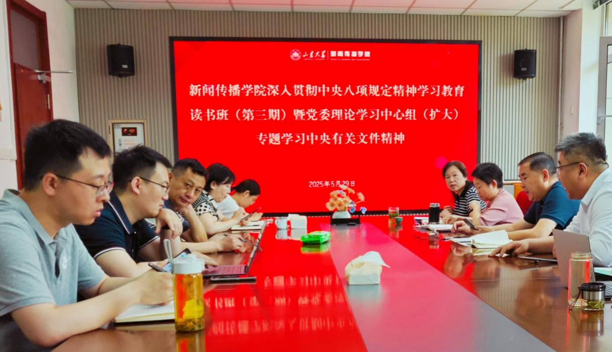为深入学习领会习近平总书记关于党的建设的重要思想,5月29日,新闻传播学院党委举行深入贯彻中央八项规定精神学习教育读书班(第三期)暨党委理论学习中心组(扩大)专题学习。