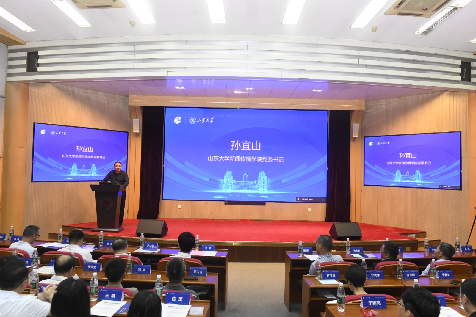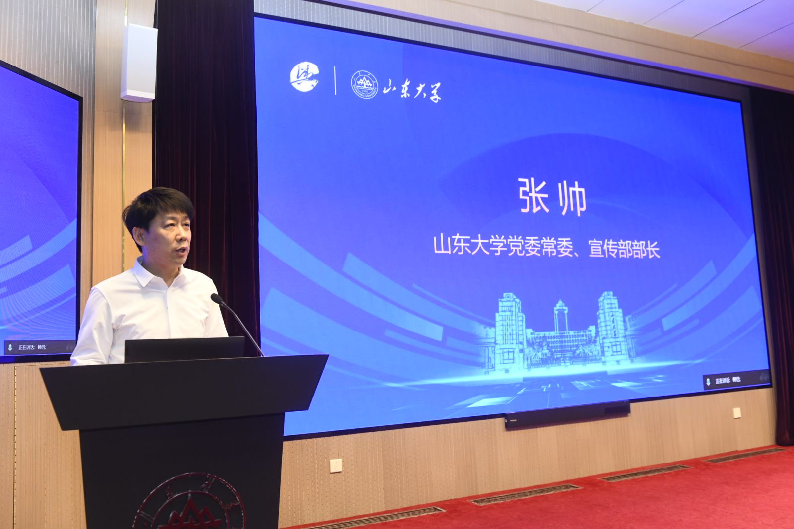 山东大学党委常委、宣传部部长张帅,中国新闻史学会会长、中国传媒大学新闻学院院长隋岩,上海交通大学党委宣传部副部长曹杰,中国新闻史学会舆论学专业委员会理事长、上海交通大学媒体与传播学院教授谢耘耕出席开幕式并致辞。开幕式由山东大学新闻传播学院党委书记孙宜山主持。