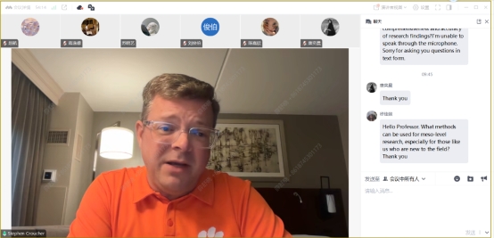 在交流环节中,参会同学与Stephen M. Croucher教授围绕跨文化传播研究中的核心议题展开深入交流,问题涵盖方法论探索、学术研究路径选择以及跨文化实践中的语言障碍与文化适应等现实挑战。Stephen M. Croucher教授逐一进行细致回应,并鼓励青年学者加强理论意识与阅读基础,同时结合自身研究经验,提出了方法建议与实践指导。