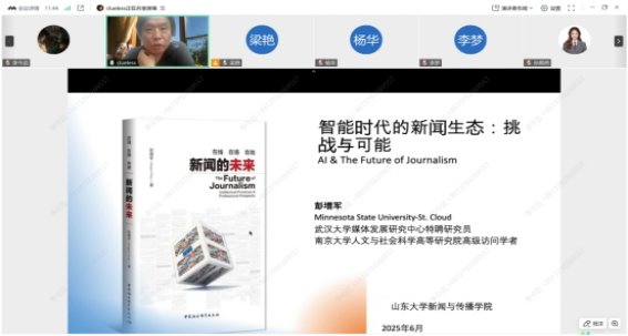 彭增军教授通过1930年至2024年人类婚恋方式变迁的数据分析,揭示媒介技术如何深度重构社会关系,并针对新闻专业的发展前景,提出“公共叙事”的核心竞争力理论。他指出“新闻传播的本质是以科学为基础的公共故事讲述——需要融合人文关怀与技术理性的双重维度”;在谈及人工智能与新闻生产时,他以2024年普利策奖获奖作品为例,展示AI如何通过弹坑识别技术完成加沙地带的战地调查报道,提到“当机器能每秒处理十亿比特信息时,记者更需要强化的是‘诚实接近真相’的专业伦理——这正是密苏里新闻学院百年传承的精神内核”。他强调面对算法主导的信息环境,新闻教育必须转向“在地性”培养,未来新闻人的价值在于将数据空间转化为承载集体记忆的精神家园”。