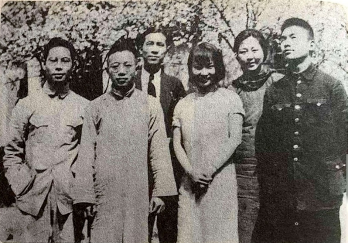 图为:1938 年初夏,《文种》同仁欢送白汝瑗、沈钧、拱德明、沈大经等同志赴延安。前排左起白汝瑗(玲君)、沈钧(现名姚天斌)、拱德明(现名龚平,亦名拱平)、沈大经(现名沈重),后排左起:王公维(笔名王洁之)、蒋兰君(笔名白莎)。