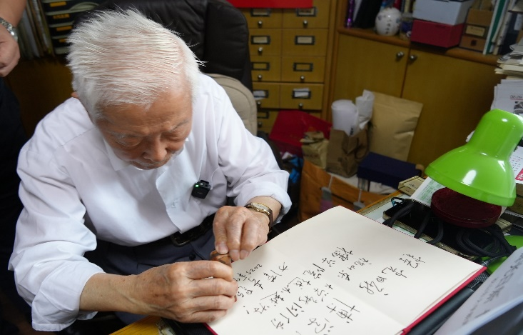 9月5日,在教师节前夕,山东大学新闻传播学院常务副院长倪万一行赴北京,代表学院拜访中国新闻史泰斗、中国人民大学一级荣誉教授方汉奇先生。倪院长向方先生汇报了学院自独立建院以来的学科建设和部校共建情况。随后学院教授王咏梅、高级工程师徐迎春、硕士生仇泽睿就山东新闻干部“北上南下”情形及历史意义采访方先生。方先生亲笔在纸上写下“辉光日新,博学洽闻。祝山东大学新闻传播学院越办越好!”赠予我院,鼓励学院继续做好学科建设工作。