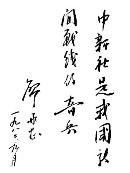 图为廖承志为中新社题词:“中新社是我国新闻战线的奇兵”