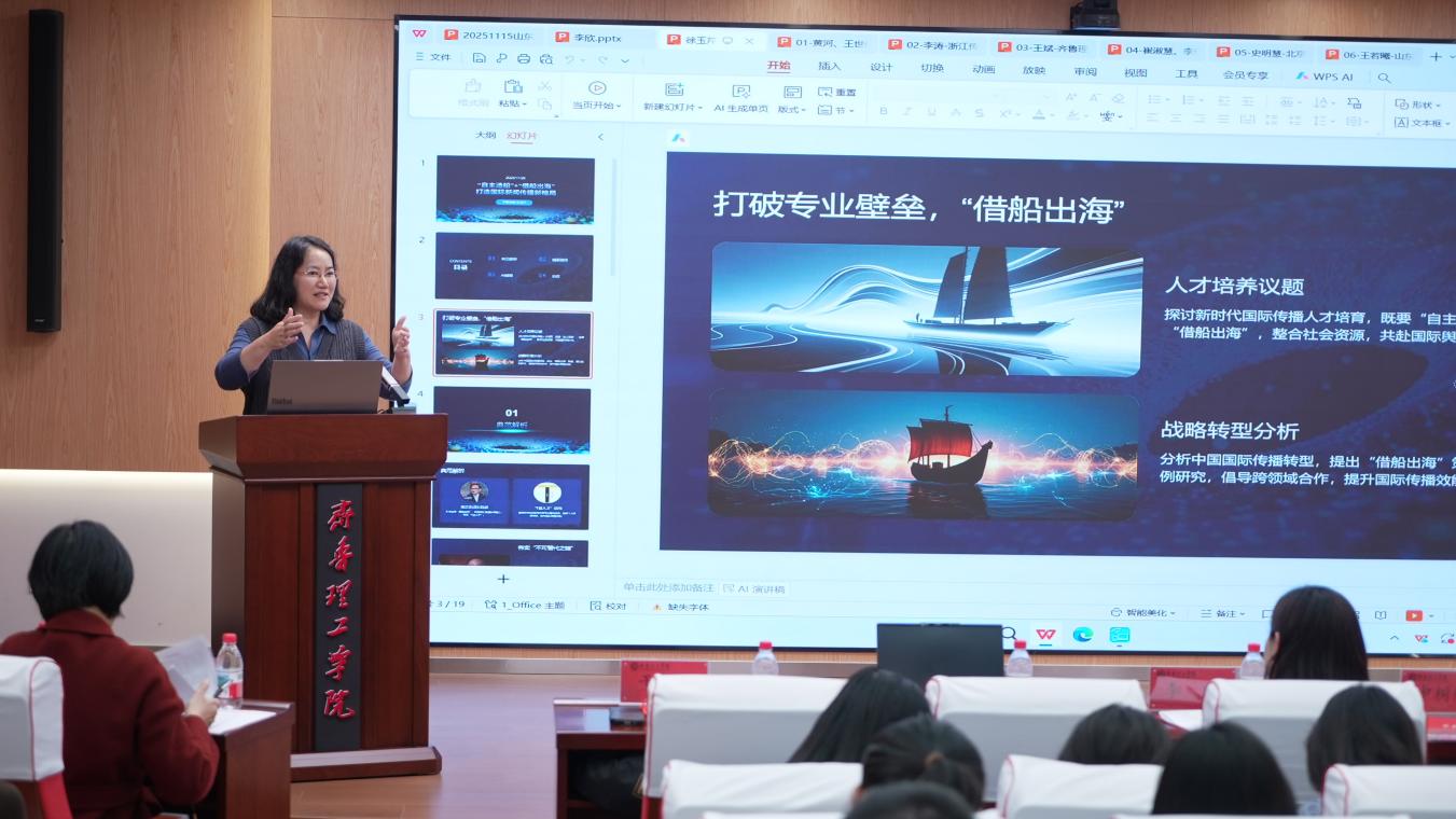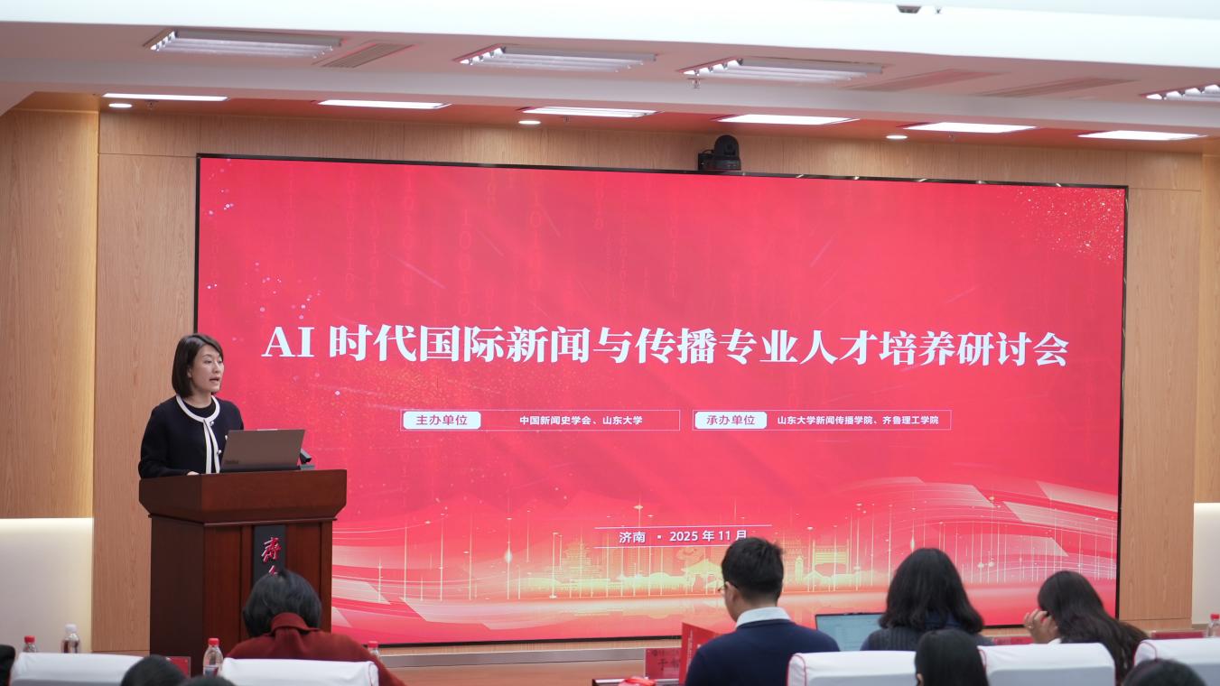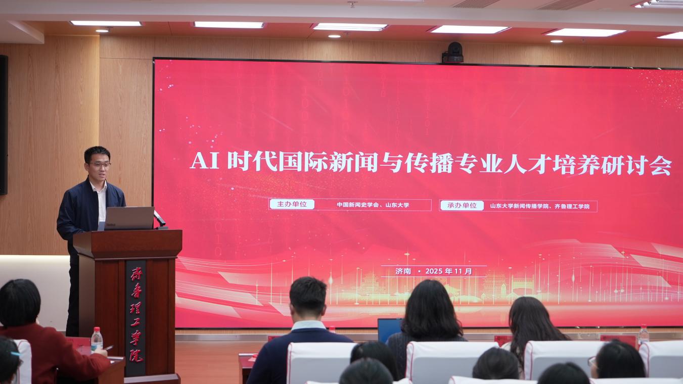 冬日暖阳,智汇齐鲁,在AI技术蓬勃发展、国际传播格局深刻变革的背景下,11月28日下午,由山东大学新闻传播学院和齐鲁理工学院联合举办的“AI时代国际新闻与传播专业人才培养研讨会”在齐鲁理工学院举行。学界业界精英共聚一堂,共同探讨AI时代国际新闻与传播人才培养的新路径。全国新文科教育研究中心办公室主任、山东大学本科生院副院长申树欣,山东大学新闻传播学院副院长、教授、博士生导师邱凌,中国新闻社山东分社总编辑李欣,大众报业集团大众国际传播中心孙先凯,齐鲁晚报·齐鲁壹点教育新闻事业部主任徐玉芹出席论坛,活动由山东大学新闻传播学院院长助理、副教授、博士生导师于智源主持;国内部分高校的师生和山东大学国际新闻与传播专业的全体本科生参加了该论坛。