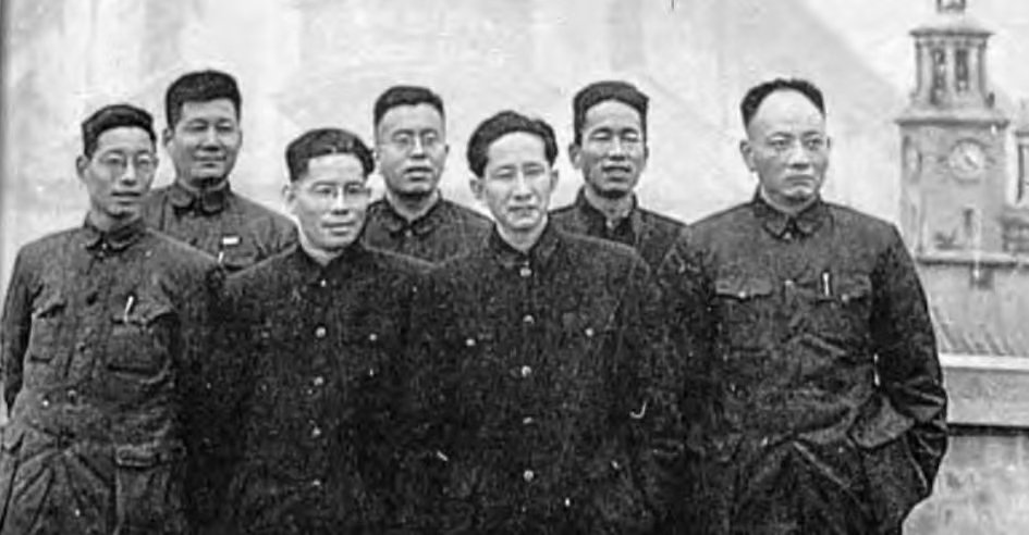 1950年,长江日报部分编委在编辑部所在地兴华大厦六楼合影,从左至右:编委吉伟青、王栋,副总编辑白汝瑗,社长兼总编辑陈楚,编委黎辛,副总编辑张铁夫、顾文华