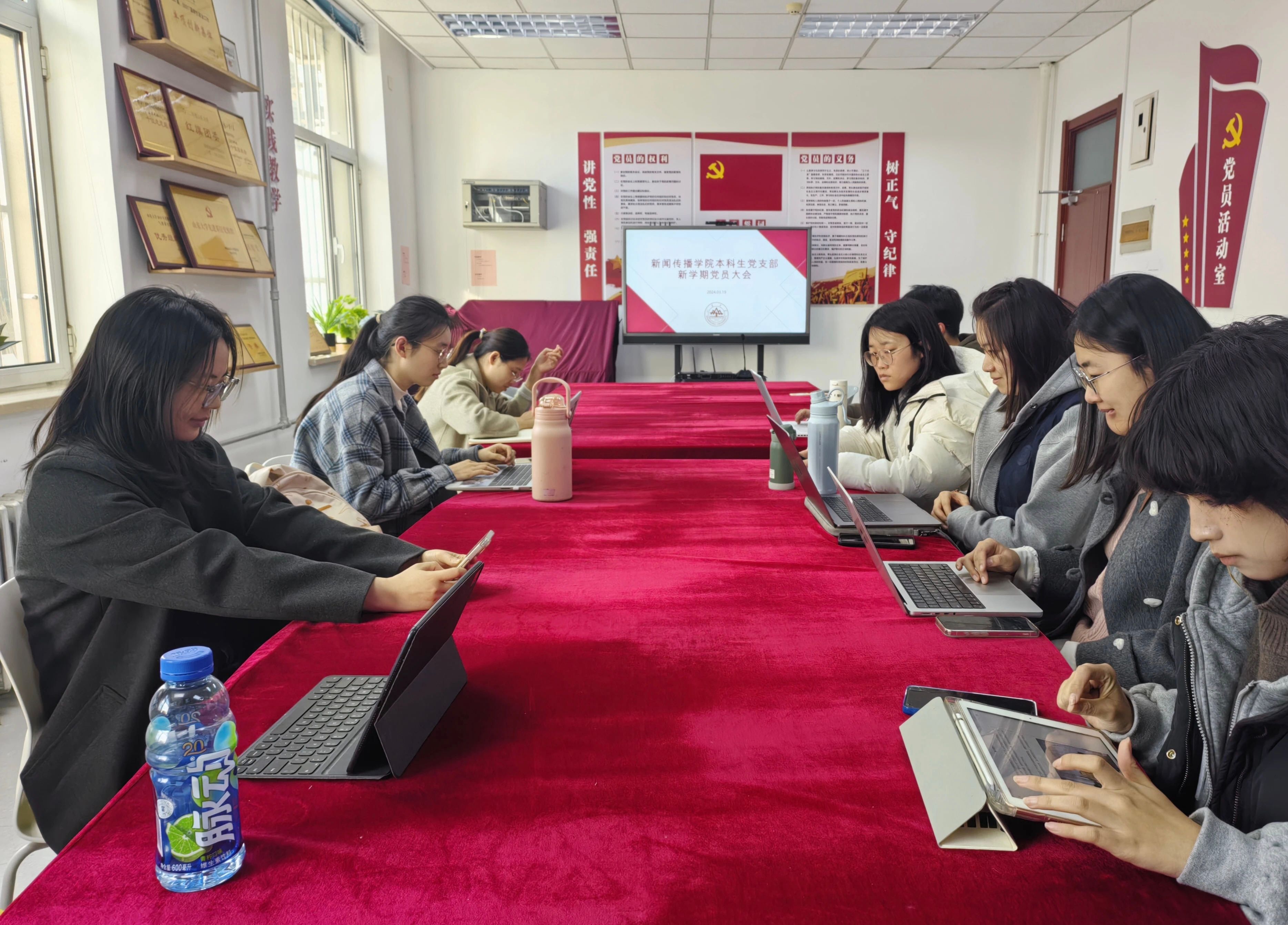 2024年3月19日下午,山东大学新闻传播学院本科生党支部于党员活动室召开2023-2024年度春季学期党员大会。本科生党支部书记王培主持会议,全体党员参加本次会议。