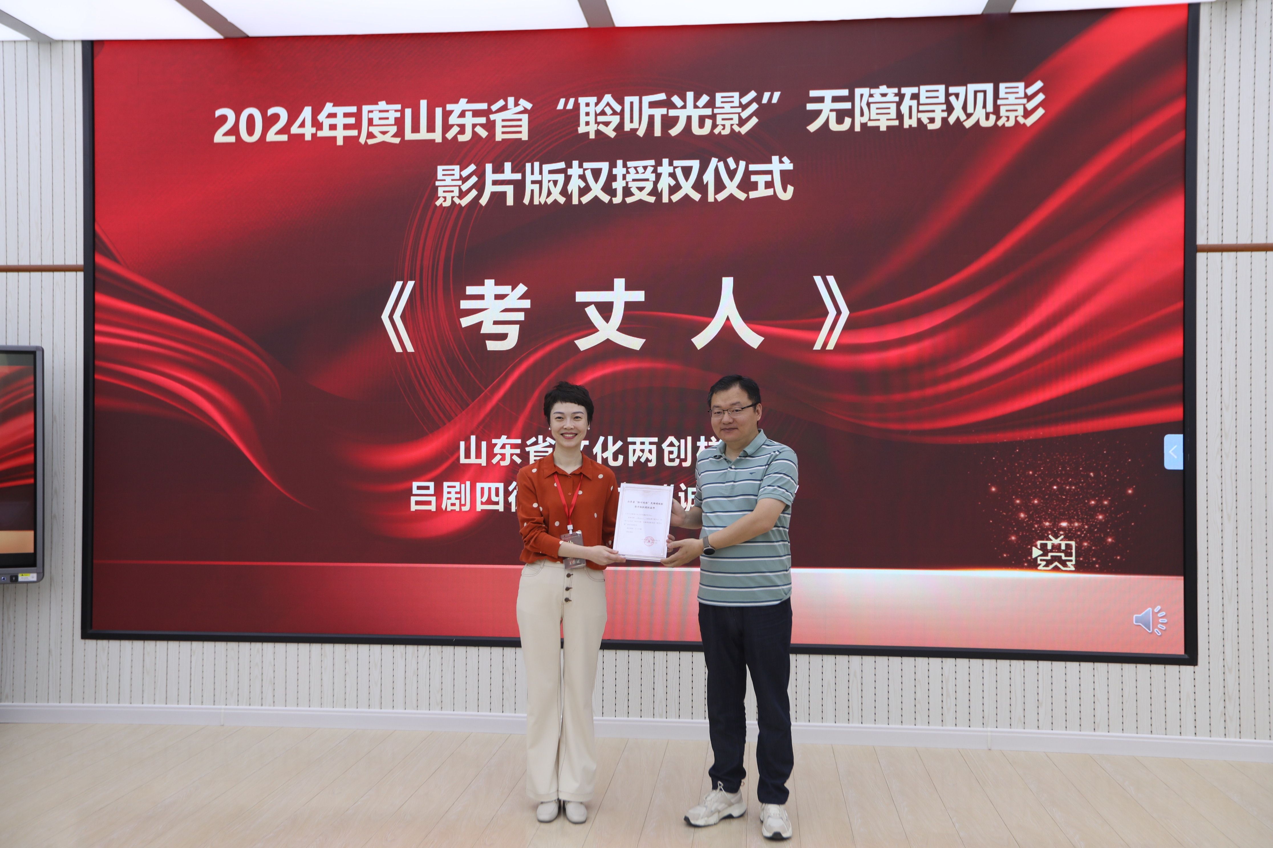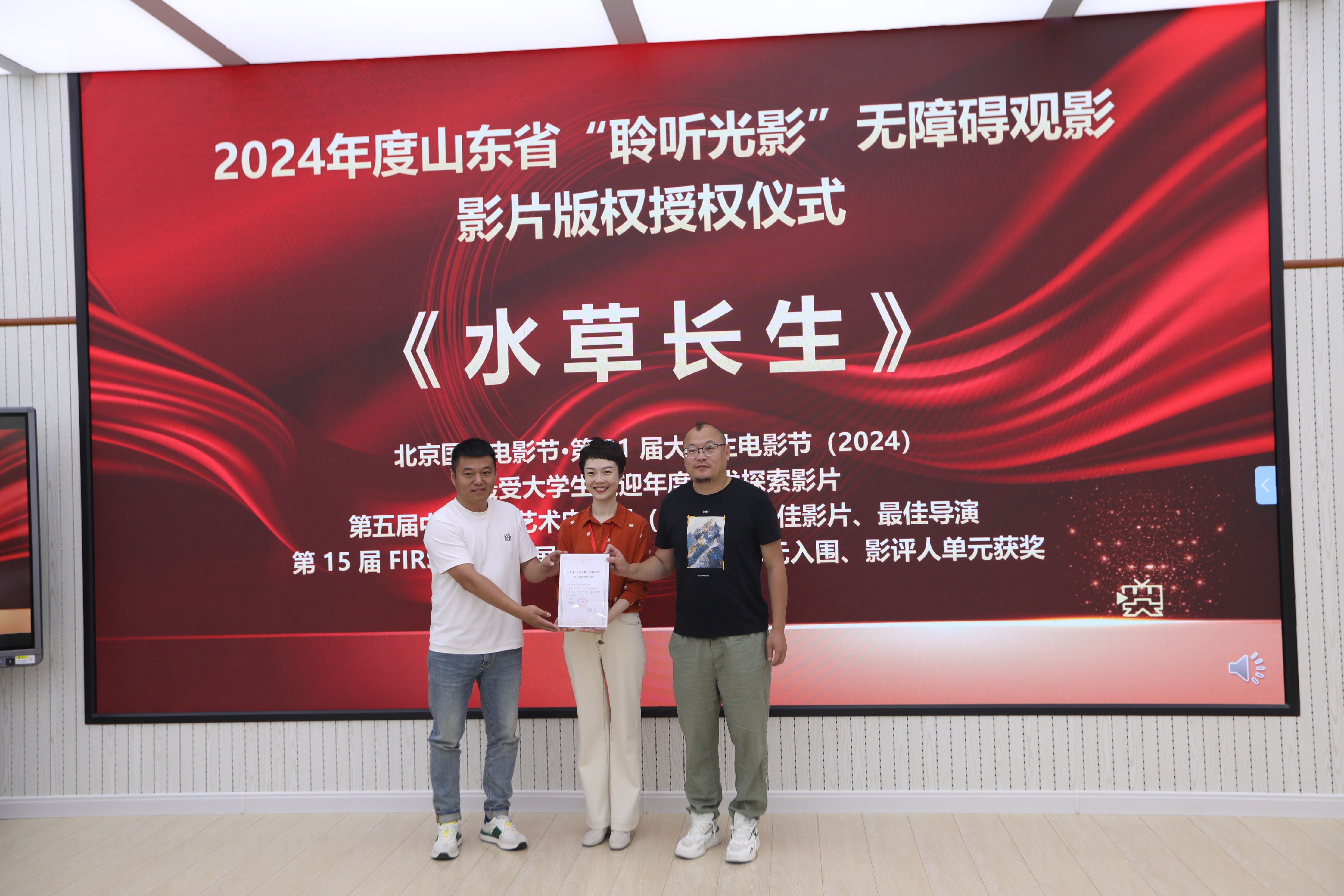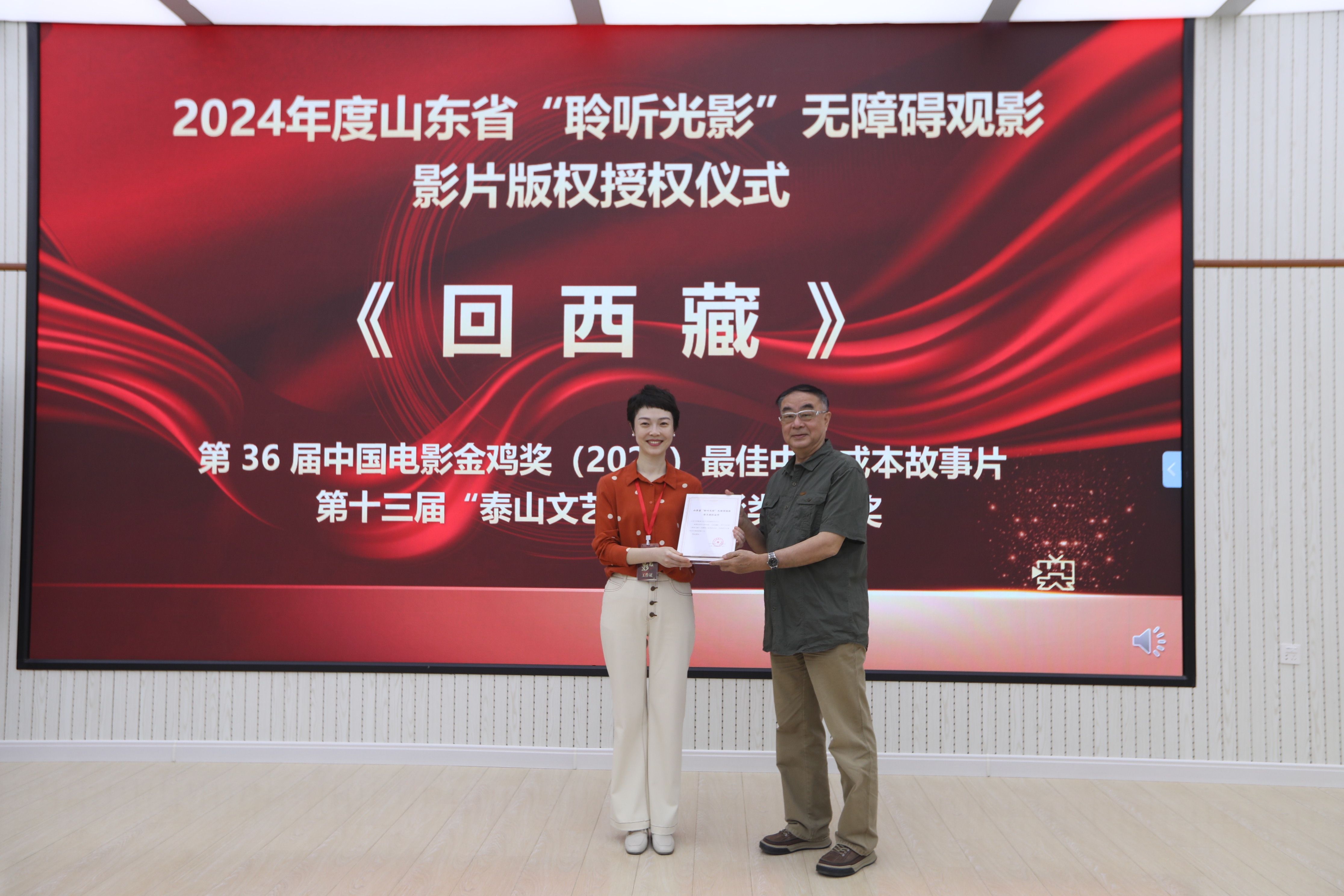 案例展演结束后,2024 山东省“聆听光影”无障碍观影影片版权授权仪式正式举行。本次授权仪式共有《回西藏》《考丈人》和《水草长生》三部影片。其中,《回西藏》是第 36 届中国电影金鸡奖(2023)最佳中小成本故事片、第十三届“泰山文艺奖”电影类二等奖影片;《考丈人》是山东省文化两创样本、吕剧四德工程之“诚德篇”;《水草长生》荣获北京国际电影节·第 31 届大学生电影节(2024)最受大学生欢迎年度艺术探索影片、第五届中国先锋艺术电影展(2023)最佳影片,第 15届 FIRST 青年影展(2021)主竞赛单元入围、影评人单元获奖。三部电影的出品方代表沈武钢、夏建华、焦峰、王峰代表片方向山东大学影视文化艺术传播研究中心代表于晓风授权。